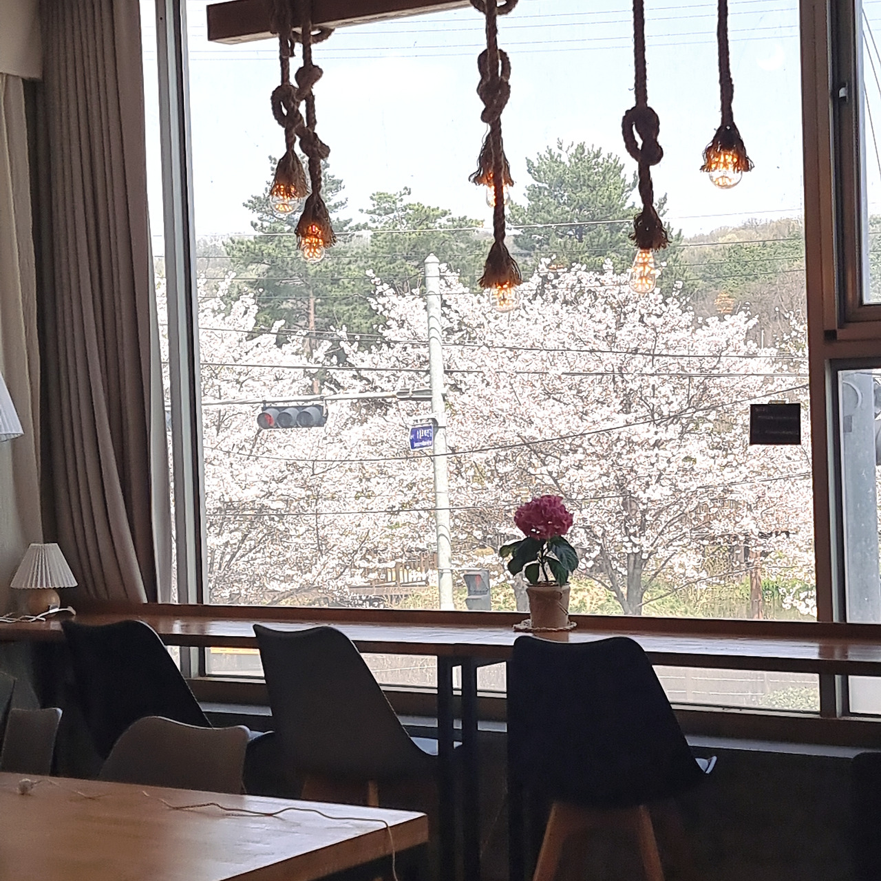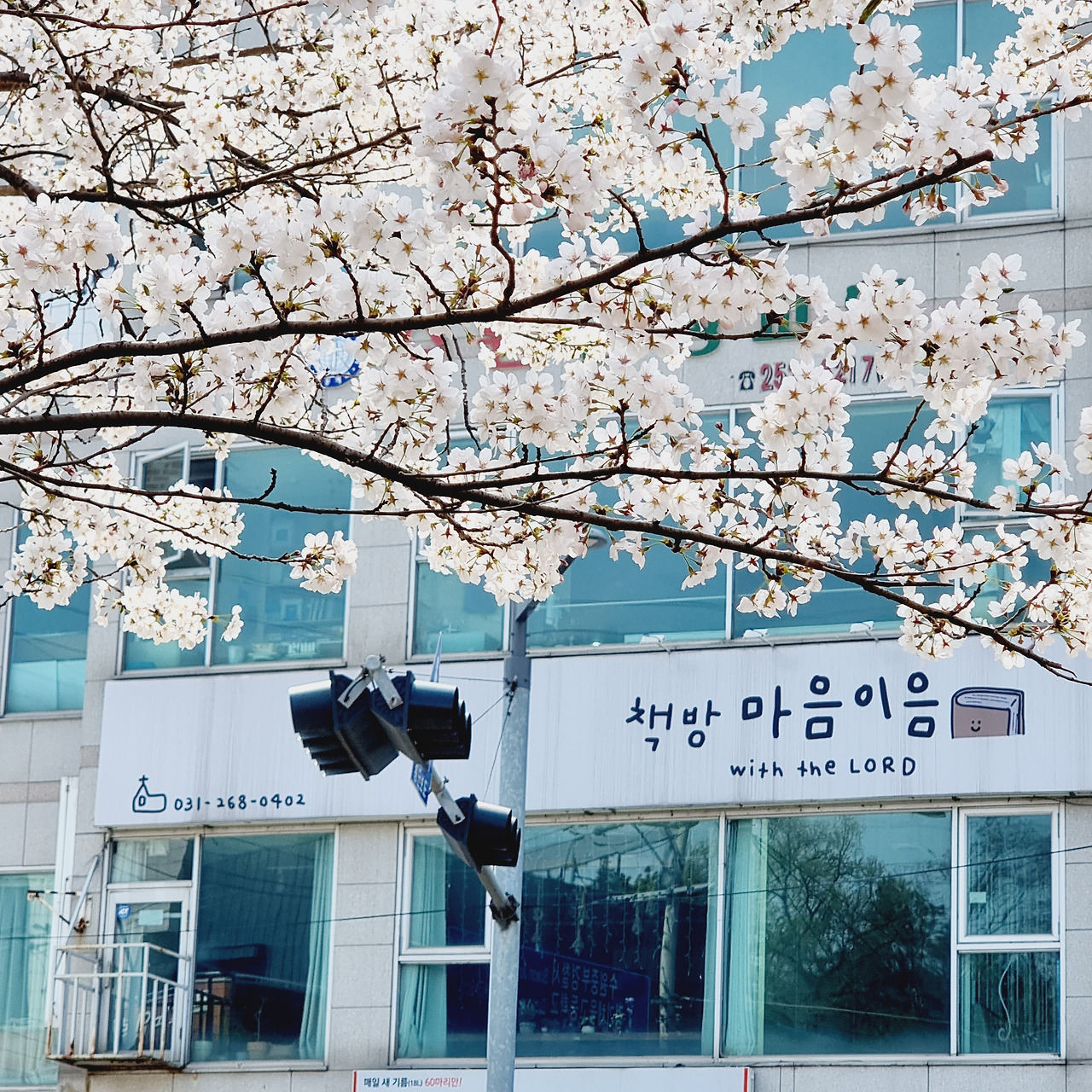 산 밑이어서 그런지 다른 곳 보다 벚꽃 개화시기가 늦은 편이다. 다른 지역의 벚꽃 사진이 SNS에 올라오기 시작했다. 설레는 마음으로 책방 창가를 자주 내다봤다. 작은 꽃순이 올라오고, 다음 날에는 꽃봉오리가 보였다. 그다음 날에는 한 두 송이가 피기 시작했다. 너무 급하다. 오후에는 팝콘이 터지 듯 여기저기에서 피기 시작했다. 3일 만에 수북하게 하양분홍이 만발했다. 며칠 출근하면서 창가에서 보이는 벚꽃 만날 생각에 일찍 집을 나섰다. 책방에 도착하면 창가에 가까이 가지 않았다. 책방 입구에 들어서서 그 자리에서 멈춘다. 나무는 보이지 않고 흐드러지게 핀 하양분홍 벚꽃만 가득한 장관을 볼 수 있기 때문이다.