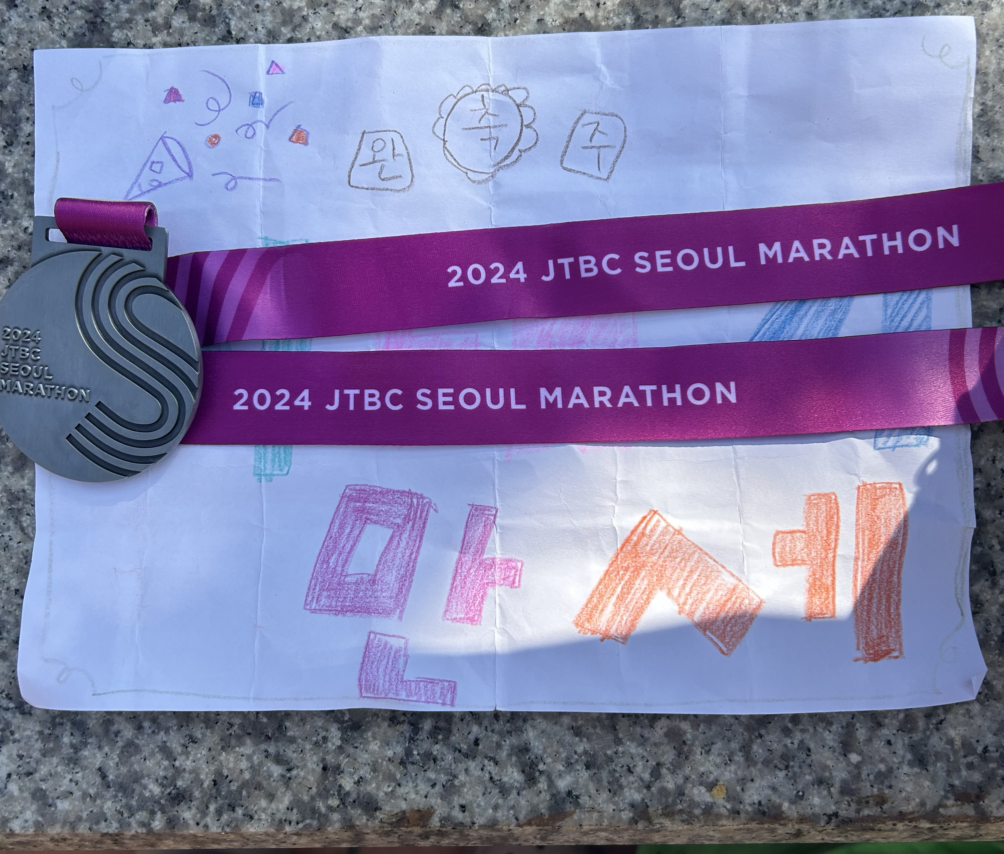 드디어 내리막이 끝났고 사거리에서 좌회전을 했다. 올림픽공원 인도변으로 엄청난 응원행렬이 있었다. '얼마 안 남았다' '힘내라' ‘화이팅’이라는 함성을 들으며 달렸다. 응원 함성을 들으면 기운이 더 날 것 같다는 생각이 순간 들었다. 기왕이면 소리를 더 잘 듣기 위해 응원행렬과 가까운 인도 쪽으로 코스를 바꿔서 달렸다. 페이스는 다시 5분대로 올라갔고, 심박은 190을 넘어가고 있었다. 힘들었지만, 여기에서 물러나면 후회가 클 것 같아서, 계속해서 발을 굴렀다. 사거리에서 골인지점까지가 2km 남짓이라고 했는데, 이 구간은 왜 이렇게 긴지, 달려도 달려도 끝이 안 보였다. 보일듯 말듯한 골인 지점이 그 순간 드디어 저 앞에 보였다. 케인던스를 높이며 있는 힘껏 힘을 내보았다. 도착지가 가까워질수록 사람들의 응원 함성도 커졌다. 나 뿐만 아니라 모든 참가자들이 마지막 남은 힘을 1쏟아붓고 있었다. 터질듯한 심장을 부여잡으며 마침내 내 인생 처음의 풀코스 마라톤 마지막 지점에 도달했다. 드디어 골인이다. 시계에서 알려준 기록은 4시간 9분 50초. 정말 간신히 4시간 10분 아래로 들어온 것이었다. 나중에 구간 기록을 확인해보니, 떨어졌던 속도는 38km 지점부터 올라가기 시작해서 마지막 1km 구간은 5분 페이스로 달렸던 것이다. 지칠 대로 지친 최후반에 속도가 올라가다니, 정말 이해할 수 없는 일이었다.