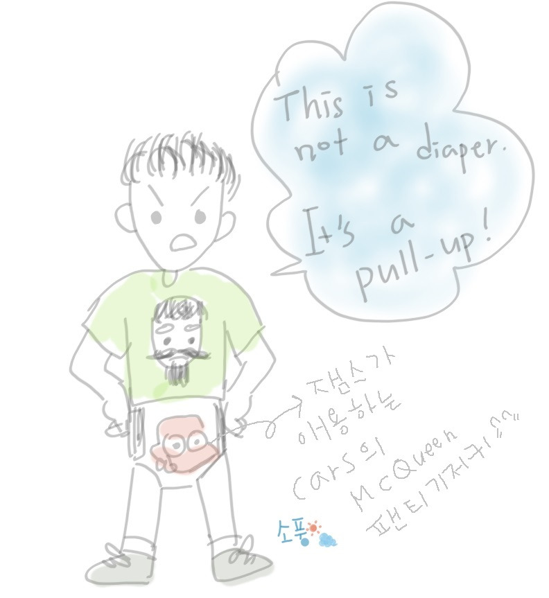 나에게는 둘 다 기저귀인건 마찬가지이지만 5살임에도 기저귀를 차는 것에 대해 부끄러워하기보다 팬티 기저귀를 차는 것에 대한 자부심을 갖는 것이 나은 것 같아서 "You are a good big boy!"라며 맞장구를 쳐주었다.