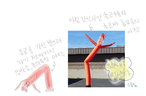 아침을 거르고 학교에 왔을 때나 이해할 수 없는 뭔가에 마음이 틀어져서 어깨를 축 늘어뜨린 채 어두운 얼굴로 입을 꾹 다물고 있는 아작은 송풍기 작동이 멈춘 광고용 바람인형(Sky Dancer)처럼 축 쳐져 있다.