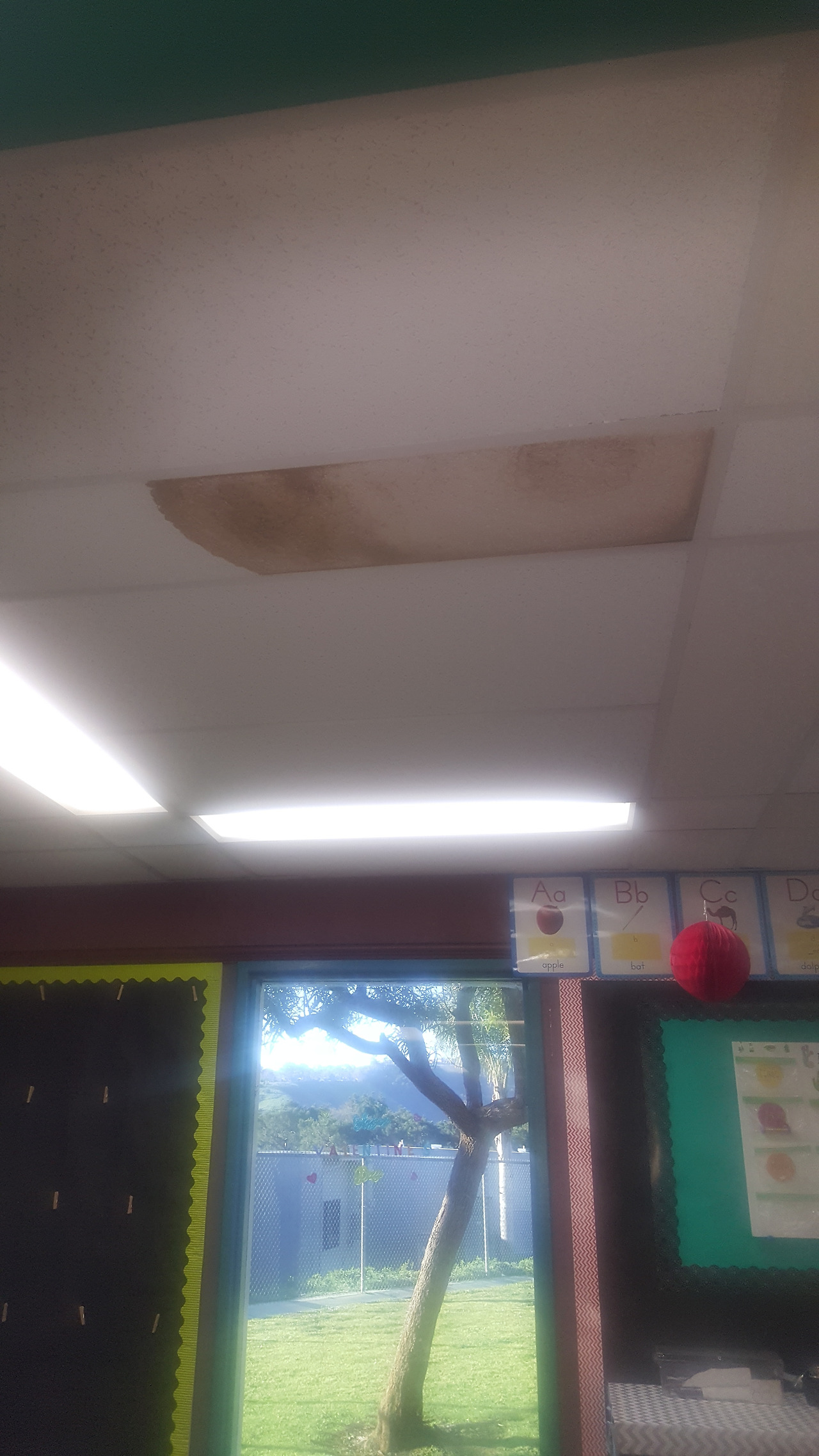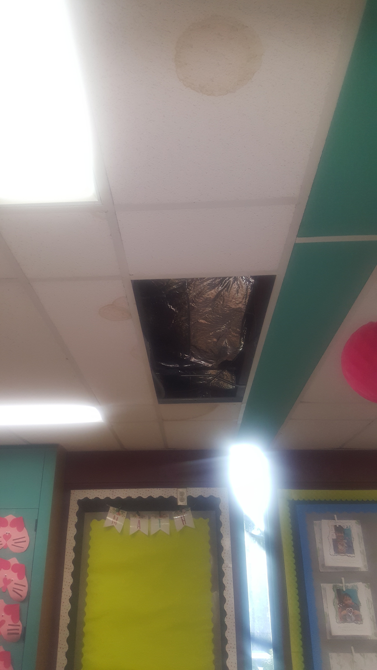 그러던 어느 날, 그 보다 더 큰 문제가 발생했다. 교실 천정이 새기 시작한 것이다.