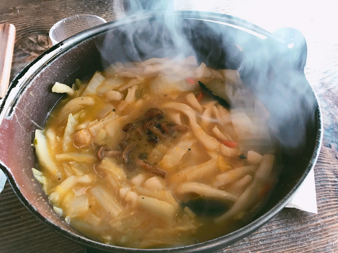 좀 오랜 시간이 지나서 내 앞에는 펄펄 끓는 무쇠냄비가 올라왔다. 좀 과장하면 세숫대야 크기의 냄비 안에는 넓적한 밀가루 면과 채소들이 무심하게 뒤섞여 끓고 있었다. 오전 내내 후지산이 내뿜는 찬바람에 시달렸으니, 뜨거운 국물부터 맛보기로 한다. 후~후~ 불어 한 김 식히고 후루룩 국물을 들이마셨다. 어? 이건? 이 맛은?? 그래 된장 칼국수! 한국 사람이라면 결코 낯설지 않은 맛이다. 젓가락을 휘저어 내용물들을 확인했다. 버섯, 배추, 양파, 단호박 등등 다양한 채소들의 영혼까지 우러난 국물이 진하고 깊을 수밖에 없다. 밀가루 면은 칼국수와 수제비 딱 중간 정도의 중용을 자랑했다. 뜨끈한 국물을 머금은 굵은 면발이 식도를 타고 넘어가면 따뜻한 기운이 온몸에 퍼지며 언 몸을 녹여 주었다. 한국의 된장 칼국수처럼 든든한 한 그릇이었다.