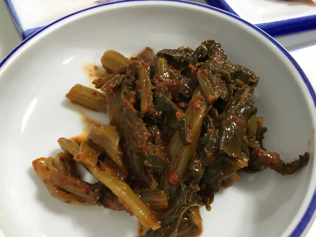 접시 안에는 제대로 곰삭은 갓김치가 다소곳하게 담겨 있다. 지난해 담갔던 갓김치는 바닥이 나서 갓철이 되어 갓김치를 담글 때까지 파김치, 묵은지만 나간다고 했다. 먹성 좋은 우리를 예쁘게 봐주셔서 얻게 된 한 접시의 호사다. 다시 소주 한잔을 마시고 갓김치를 얹은 삼치회를 먹었다. 쿰쿰하게 익은 갓김치는 그야말로 [ GOD-김치 ]였다. 젓국도 고춧가루도 듬뿍 들어간 갓김치에 간장 양념장도 가득 찍었는데 왜인지 짠맛은 하나도 느껴지지 않았다. 그게 바로 숙성의 힘일까?