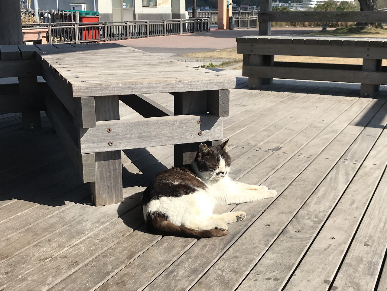여유롭게 걸어오는 부모님께 빨리 오시라 손짓을 했다. 부모님의 얼굴도 환해졌다. 총 100m나 되는 긴 족욕탕 한편에 자리를 잡고 발을 담갔다. 뿌연 온천물은 제법 따끈했다. 눈앞에는 긴코만의 푸른 바다가 펼쳐져 있고 사쿠라지마 화산의 품에 안겨 족욕을 즐겼다. 가고시마의 겨울바람은 분명 차가웠지만 날카롭지는 않았다. 부드러운 해풍이 뺨에 닿았고, 따뜻한 물이 발가락 사이사이를 휘감았다. 엄마 아빠와 셋이 나란히 앉아 사쿠라지마산 작은 귤, 코미깡을 까먹으며 족욕을 하고 있으니 행복이 이거다 싶었다. 근처엔 길고양이들이 한가롭게 그루밍을 하고 있었다. 프라이팬 위에서 구워지는 인절미처럼 몸도 마음도 나른하게 퍼졌다. 엄마는 콧노래를 불렀고, 아빠는 핸드폰으로 연신 사진을 찍었다. 시간에 쫓기지도 않았고, 뭐라고 할 사람 하나 없었다. 느긋하게 보낸 사쿠라지마 족욕탕의 여운은 우리 가족을 다시 사쿠라지마섬으로 향하게 만들었다.
