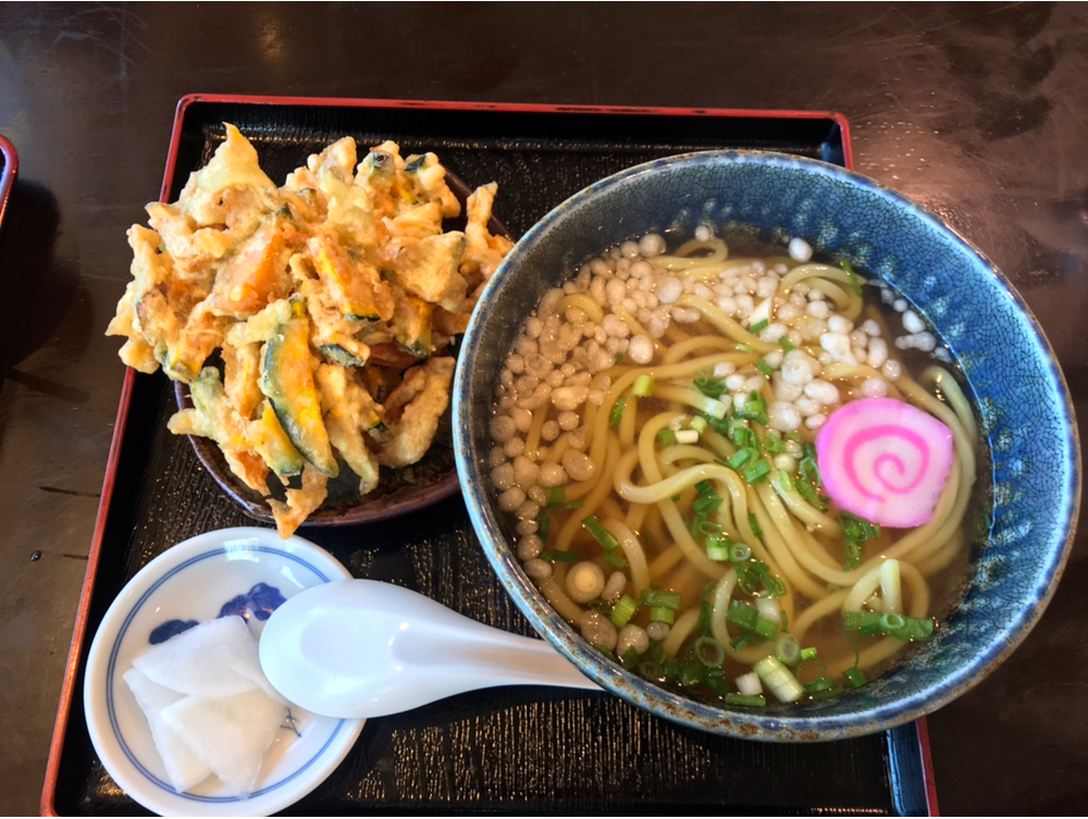 어머니들의 패기는 여기에서 끝이 아니다. 코미깡 우동 세트에 사이드로 딸려 나온 채소 튀김의 크기는 거의 우동 그릇과 비슷할 만큼 볼륨감이 있었다. 단호박, 고구마를 굵게 채 썰어 뭉쳐 튀겨낸 튀김이었는데 그거 하나만으로 배가 가득 찰게 분명했다. 당연히 미리 튀겨둔 튀김을 데워주는 수준이었지만 포슬포슬하고 달큰한 채소 특유의 맛이 살아 있었다. 식은 튀김 특유의 찌듯 맛은 느껴지지 않았다. 코미깡 우동 세트의 하이라이트인 우동은 약간 노란색이 도는 면에 쪽파, 어묵 조각, 텐카츠(튀김 부스러기)뿐이었다. 국물부터 한 입 떠먹었다. 짜지도 싱겁지도 않은 감칠맛이 입 안 가득 퍼졌다. 그리고 면을 한 젓가락 집어 후루룩 넘겼다. 탱글한 면이 입안을 휘감은 후 떠난 자리에는 은은한 귤향이 남았다. 보통의 우동면보다 진한 색감은 사쿠라지마 섬에서 나고 자란 코미깡 덕분이었다. 분명 평소 내가 먹는 양에 비해 넘치는 양이었음에도 뒷맛이 깔끔했기 부담스럽지 않았다.