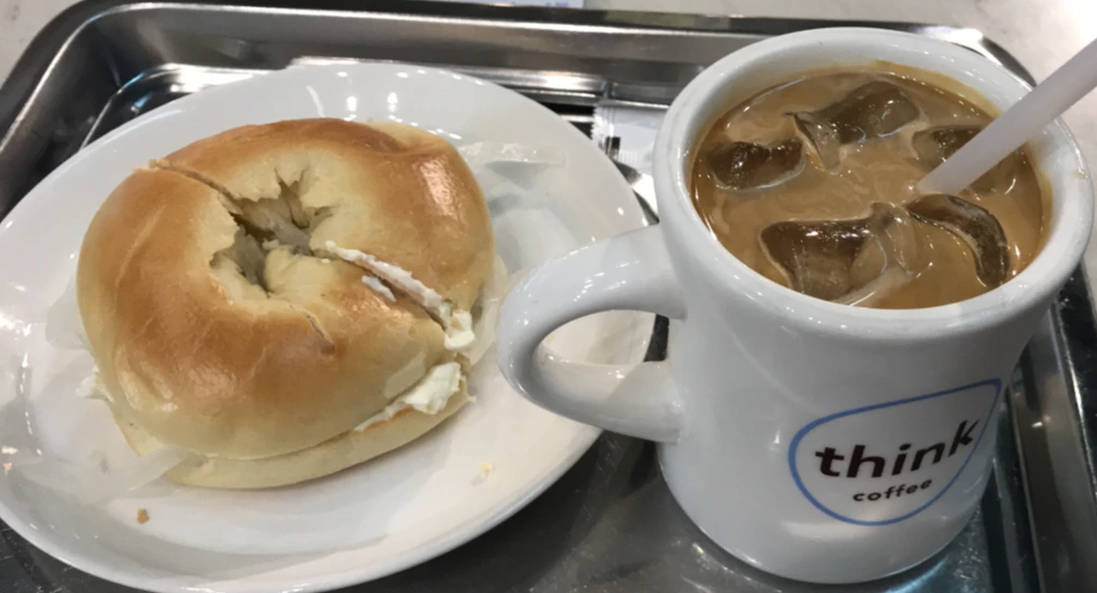 관찰 겸 상상 놀이가 지루해질 때 즈음, 자리를 털고 일어나 지하의 <띵크 커피>로 갔다. 평소라면 출국 수속을 서둘러 마치고, 면세구역에 들어가 습관처럼 스타벅스에 갈 나였다. 탑승구 앞 의자에서 스벅 커피를 마시며 복잡하고 까다로운 출국의 관문을 무사통과하는 것을 자축하는 게 나의 습관이다. 하지만 이번엔 여권도, 비행기 티켓도 없이 공항에 왔으니 선택지는 좀 더 많아졌다. 지하라 뷰는 별로지만, 진한 커피가 먹고 싶어 택한 곳이 <띵크 커피>다. 그곳에 주문을 받는 직원을 제외하면 한국인은 1명도 없고, 모두 외국인 뿐이었다. 공항리무진을 타느라 서두른 탓에 못 먹은 아침을 대신해 라테와 베이글을 시켰다. 외국인 가득한 카페에서 베이글과 커피를 먹고 있으니 잠시지만 먼 곳으로 여행을 떠나와 아침을 먹는 기분이 들었다. 뉴욕의 어느 지점을 그대로 재현한 분위기 덕분인지 가보지도 않은 뉴욕에 와 있는 착각을 할 뻔했다. 그곳에서 누군가의 여행기를 담은 책을 읽고 있으니 완벽하게 여행을 떠나온 기분이 마일리지처럼 차곡차곡 쌓였다.