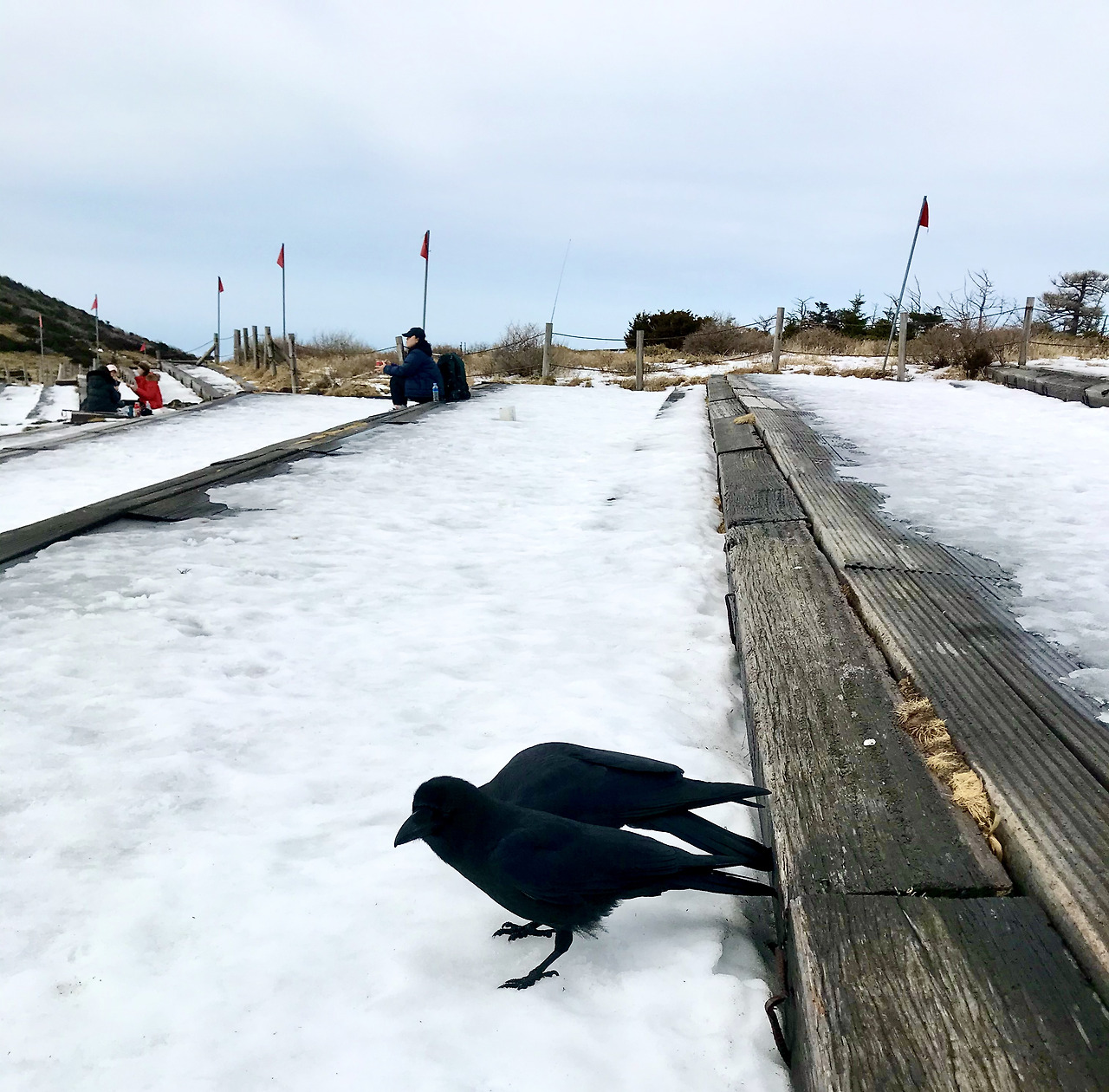 주변 등산객들의 존재도 잠시 잊고 까마귀를 향해 꽥하고 소리를 질렀다. 속수무책 김밥의 햄을 강탈당한 인간의 뒤늦은 방어를 비웃기라도 하듯, 그들은 멀리 도망가지도 않았다. 채 1m도 벗어나지 않은 채 내 주위를 맴돌며 호시탐탐 기회만 노리고 있었다. 한두 번 해본 솜씨가 아니었다. 조류 공포증이 있는 건 아니지만, 공격적인 한라산 까마귀의 날갯짓에 쫄보는 정신이 혼미해졌다.