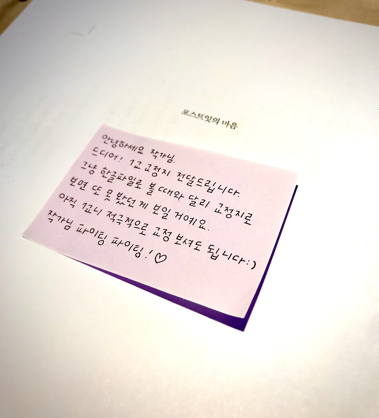 <포스트잇처럼 가볍게 살고 싶어>라는 최종 제목이 생기기 전의 일이다. 가제였던 <포스트잇의 마음>이라는 제목이 박힌 교정지 맨 앞장에 포스트잇이 붙어 있었다. 손글씨는 가늠할 수 없는 엄청난 힘을 가지고 있다. 포스트잇 가득 또박또박 힘주어 쓴 에디터의 메시지를 보며 울컥 눈물이 차올랐다. 나를 둘러싼 돌발상황이 발목을 잡았던 날들, ‘내 글 구려병’에 걸려 골골거리던 날들이 영화 필름처럼 스쳐갔다. 그제야 내 생애에 없는 일일 줄만 알았던 ‘출간’이 한층 선명하게 보이기 시작했다. 그야말로 조금만 힘을 내 손을 뻗으면 닿을 거리에 ‘출간’이 다가와 있었다.