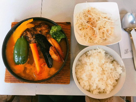안으로 들어가니 다찌 테이블까지 포함해서 10석 정도 될까 말까 하는 작은 공간이 보인다. 주문한 지 얼마 지나지 않아 거대한 양의 밥과 뜨거운 철판 위에 소스가 넉넉하게 담긴 함박스테이크가 내 앞에 세팅되었다. 거의 수프 수준의 넉넉한 소스를 떠서 한 입 맛을 보니 깊고 진한 향신료의 맛 위로 함박스테이크에서 우러나온 육즙 맛이 느껴진다. 피망, 단호박, 가지, 감자, 당근 등 곁들인 가니쉬 신선한 본연의 맛이 느껴졌다. 홋카이도대를 구경하느라 꽁꽁 얼었던 몸이 스르르 녹는다. 흔히 먹는 토마토 스튜의 맑은 버전 맛이다. 함박 스테이크도 잡내 없이 깔끔한 맛이었다. 동행은 간장 베이스 소스가 곁들여진 와풍(和風) 함박스테이크를 시켰는데 그것 또한 특색 있고 정성이 묻어나 보였다.