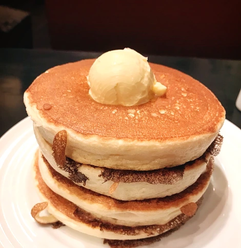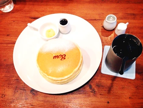 한동안 잊고 있던 팬케이크를 향한 사랑이 다시 불타오르게 된 건 오사카에 가서 였다. “쿠이 다오레(食い倒れ ; 너무 많이 먹어서 쓰러짐)의 도시”라는 별명이 붙은 오사카. 배불러서 쓰러질 때까지 먹으며 돌아다니는 것’이 미덕인 곳에서 교과서같은 팬케이크를 만났다. 그 전까지만 해도 버핑 팬(버터 핑거 팬케이크)류의 미국식 팬케이크에 익숙했던 나였다. 내 인생에 있어 음식과 맛에 대한 관심이 최고조에 달했을 때 떠난 오사카 여행. 그곳에서 구름을 먹는 듯 보드랍고 포근한 맛의 팬케이크를 맛보게 된 것이다. 모그(Mog)는 팬케이크로 일대에 명성이 자자한 카페다. 평일 늦은 오후 시간임에도 약 30분 정도 웨이팅 후에야 카페 안으로 입성할 수 있었다. 카페에 들어서자 달콤한 향기가 가득했다. 테이블석이 만석이라 다찌석에 앉았는데 그것이 신의 한 수였다. 팬케이크가 만들어지는 과정을 고스란히 관찰할 수 있었기 때문이다. 내가 앉은자리 바로 앞 대형 철판(?)이 자리 잡고 있었고 그곳에서 직원은 쉴 새 없이 팬케이크를 굽고 있었다. 반죽을 붓고 그것이 적당한 두께로 부풀어 오르면 묘기를 부리듯 단번에 뒤집었다. 그리곤 팬케이크 위에 뜨겁게 달군 인두로 “Mog “라는 이름을 도장을 찍는다. 그렇게 완성된 팬케이크는 내 앞으로 바로 이동했다. 인기 No. 1 메뉴였던 플레인 팬케이크를 시켰기 때문에 버터와 메이플 시럽을 제외하고는 아무것도 없는 심플했다. 팬케이크 그 자체는 생김새 그대로 군더더기 없이 깔끔한 맛이었다. 하지만 버터를 곁들이니 풍미가 배가 됐고, 메이플 시럽까지 뿌리니 완벽해졌다. 팬케이크의 교과서가 있다면 이런 맛이 아닐까? 잠시 생각했다. 그렇게 모그의 팬케이크는 나에게 팬케이크의 정석이 무엇인지 제대로 보여주었다.