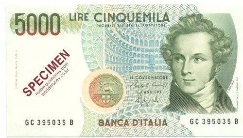 이탈리아의 위대한 오페라 작곡가이며 벨칸토 오페라의 중심인물인 ‘빈센초 벨리니’는 오페라 <청교도>, <몽유병의 여인>, <노르마> 등의 작품을 남겼는데요. 놀랍게도 이탈리아의 5,000리라 지폐의 앞면은 벨리니 대극장을 배경으로 한 벨리니의 얼굴이, 뒷면은 그가 가장 아꼈던 오페라 <노르마>의 한 장면이 새겨져 있습니다. 지금은 사용되지 않는 이탈리아의 구 화폐 ‘리라’에는 말이죠.