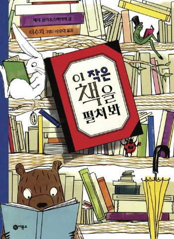 앞표지 그림에는 살아 있는 나무 책꽂이를 배경으로 허공에 매달린 듯한 빨간 책 한 권이 그려져 있고 이를 무당벌레가 받치고 서 있다. 바로 그 책 표지에 우리가 펼쳐보게 될 그림책의 제목이 들어 있다. 또 여러 동물들이 책꽂이에 걸터 앉아 책을 보고 있다. 그러니까 커다란 그림책 속에 책 여러 권이 등장하는 형상이다. 표지 그림을 보면 이 그림책에서 책을 읽는 이는 개구리, 토끼, 곰, 무당벌레로 동물이고, 우리는 이 큰 그림책의 독자로서 책 속에 나오는 작은 독자인 동물들의 책읽기를 엿볼 수 있을 뿐이다.