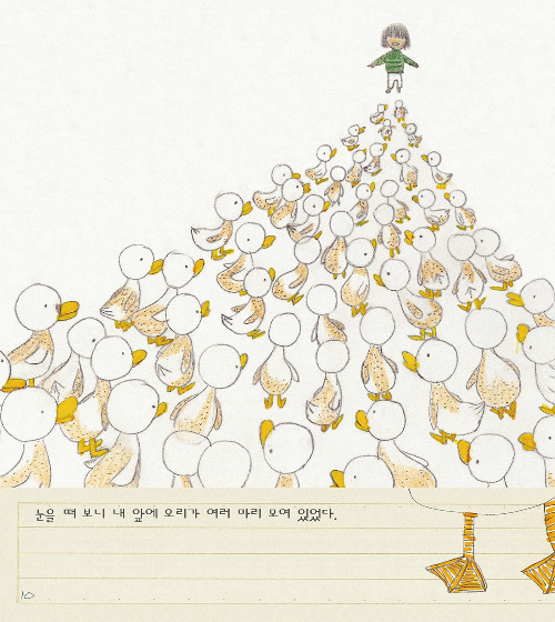 김동수의 그림책 『감기 걸린 날』(보림)에는 엄마가 장만해준 점퍼에서 삐져나온 깃털에 사로잡힌 아이가 등장한다. ‘나’의 꿈에서는(어린이책에서는 자주 보지 못했던) 제법 기괴한 이미지가 이어진다. 온몸에 털이 빠진 끝도 없는 오리 떼가 ‘나’를 향해 몰려드는 것이다. 아이는 어떠한 말로 오리를 설득하거나 이해시키는 대신, 오리의 요청을 성실하게 들어준다. 점퍼의 털을 하나하나 뽑아서, 끝도 없이 이어지는 오리 떼 하나하나에게 다시 심어주는, 지루한 과정에 대한 반복 묘사가 이어진다.
