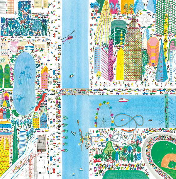 글자와의 관계도 그림에 중요한 장치 역할을 하게 됩니다. 자음 ‘가’에서 ‘하’는 모두 그림의 한 구성으로 이루어져 꼭꼭 숨겨져 있습니다. 글자 ‘가’가 숨겨질 첫 장면의 배경은 ‘가’로 시작되는 도시와 연관된 단어 ‘가로등’이 선택되고, 배경은 가로등이 그려진 이미지가 되어야 했습니다. 예를 들어 ‘가’는 가로등, ‘나’는 나무, ‘다’는 다리 등 각 페이지마다의 배경이 되는 요소가 정해지고 그 안에 글자를 숨겨두는 형태였어요. 글자로 바뀐 경기장과 아파트, 버스와 사람들, 지하철은 숨은그림찾기의 주인공이 되어 책 보는 재미를 더합니다. 우리 주변에 늘 존재하는 것들이 글자로 변신하려면 각각의 객체들이 뭉치거나 흩어지거나를 반복하고, 객체를 둘러싼 공간이 모두 포함된 프레임 안의 구도가 중요한 역할을 해야 했습니다. 글자 ‘아’의 장면에서 동그란 작은 정원은 모음 ‘ㅇ’을 나타내며, ‘ㅇ’을 둘러싼 아파트의 구도는 ‘ㅇ’을 더 효과적으로 보여줍니다.