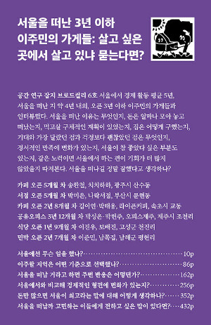 서울을 떠나는 결정이 자발적인 선택이었는지 아니면 어쩔 수 없는 상황에 따른 것이었는지 살펴보고자 했다. 자발적이었다면 이유는 뭐였는지, 어쩔 수 없는 길이었다면 무엇이 왜 어쩔 수 없었는지, 이주가 아닌 다른 대안은 없었을지 이어서 묻고 싶었다.