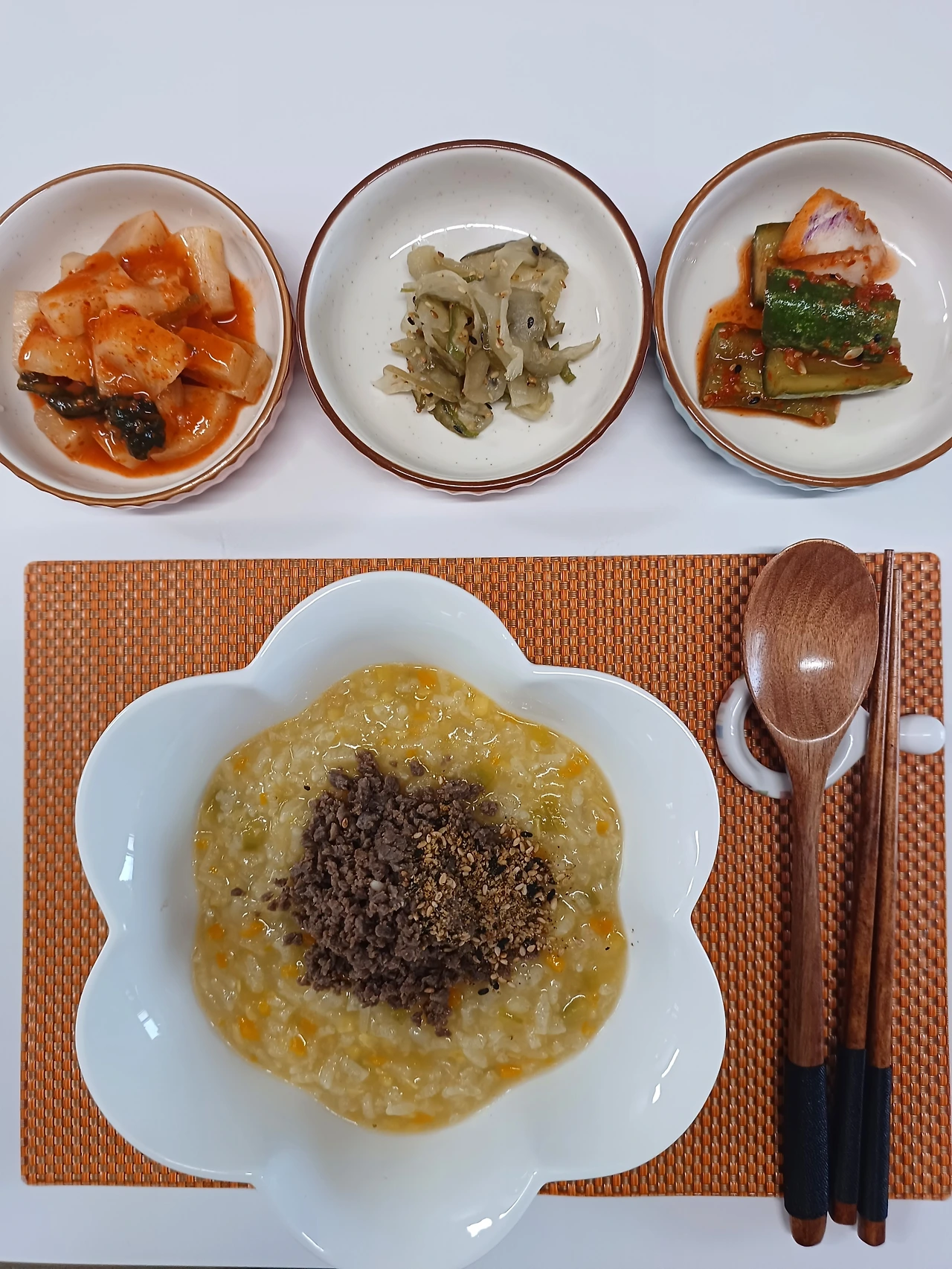 불린 찹쌀을 참기름에 볶다가 구기자 채수를 넣어 보글보글 끓이다가 다진 야채와 마늘 소금으로 간을 더했다. 야채죽 위에 볶은 소고기를 올리고 마지막에 깨를 손바닥으로 바락바락 으깨 고소함을 더해 주고 참기름 한 바퀴를 둘렀다.