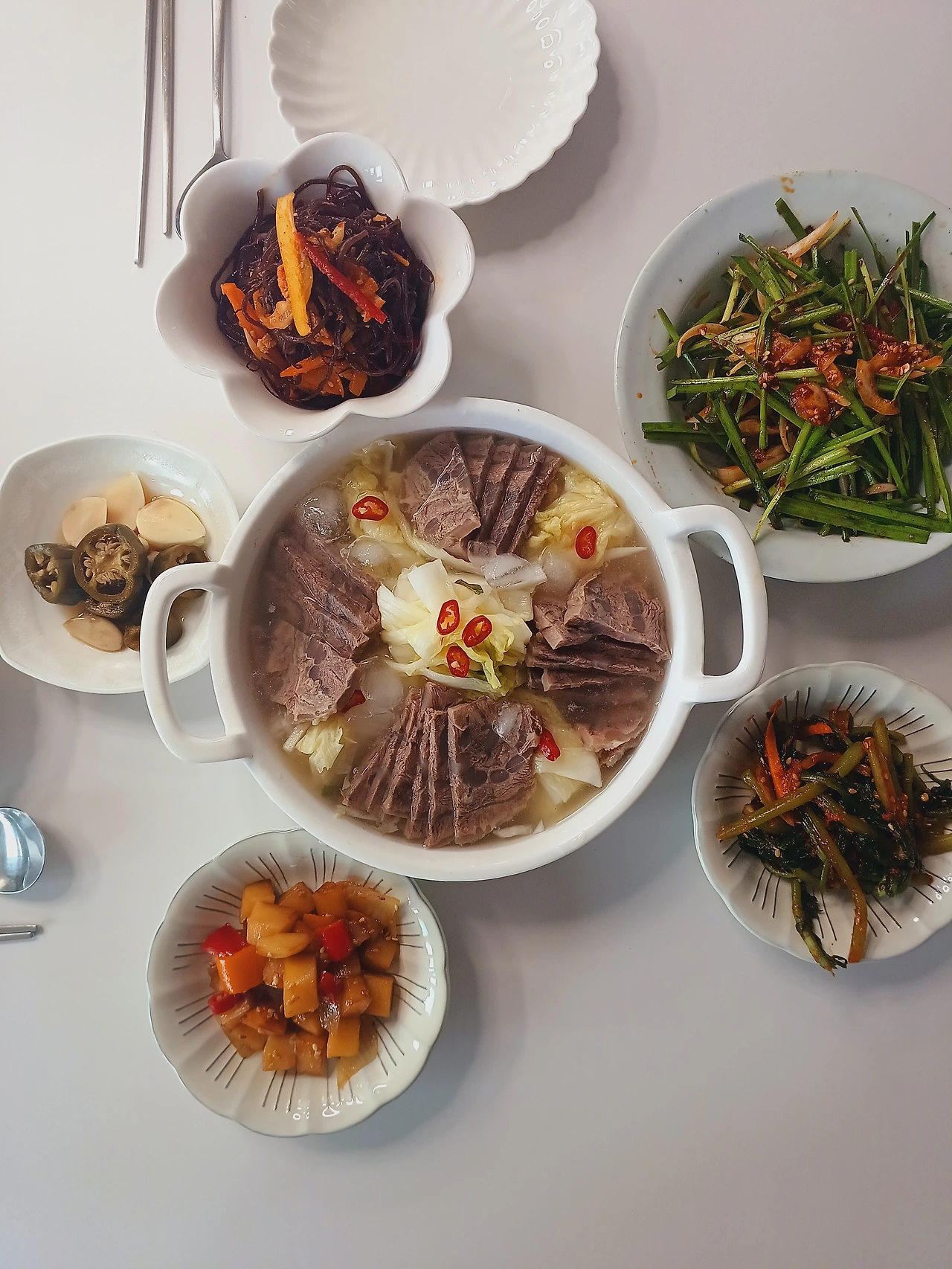 식구 수가 많으니 식비가 꽤 많이 들었던 시절, 결이 곱고 쫄깃한 식감과 가성비 좋은 아롱사태로 메뉴를 많이 만들었었다. 잡내도 많이 나지 않으니 삶아 놓기만 하면 간편하게 다양한 상차림을 준비할 수 있었다.