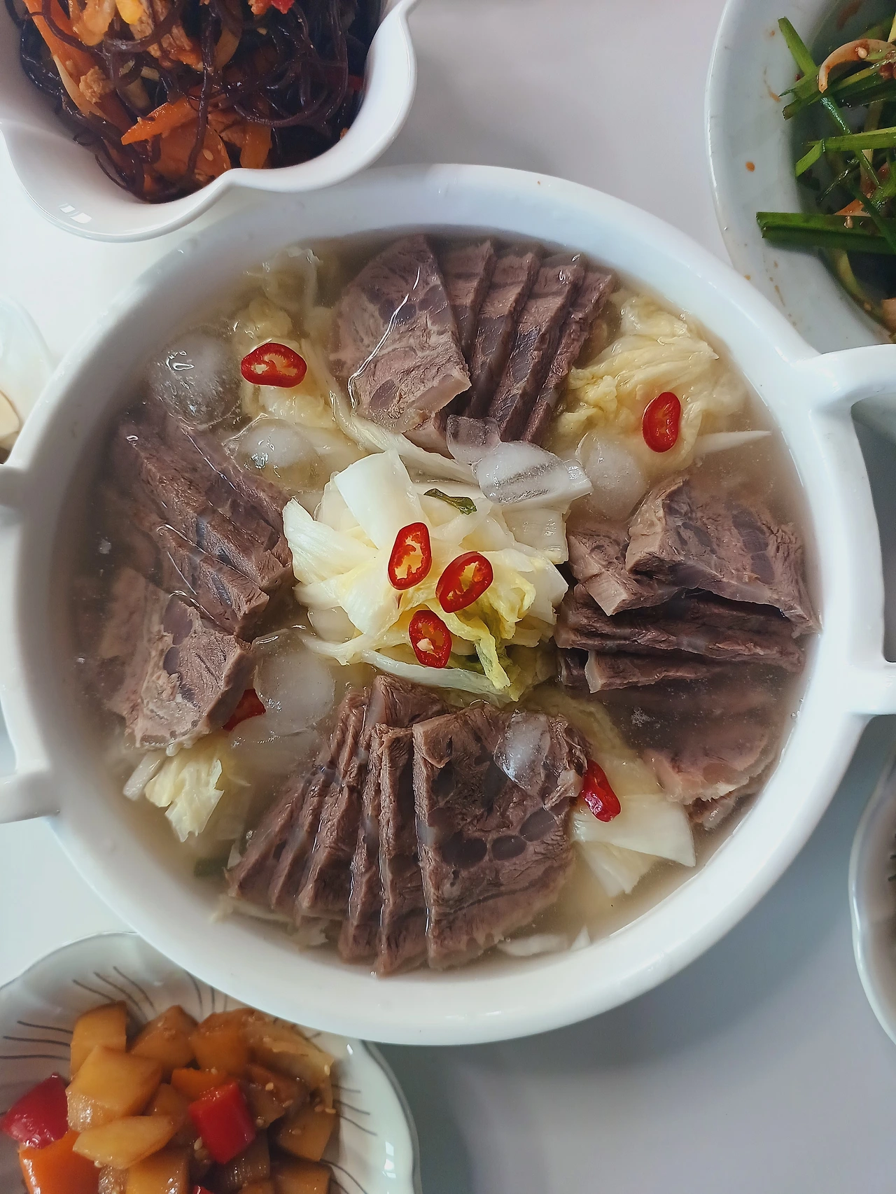아이들 시험 때면 소고기 사태부위로 토마토 스튜와 카레를 만들었었고, 요즘처럼 무더위에 기운이 빠질 때는 아롱사태 수육과 백김치, 국수를 함께 세팅하고 냉면 육수를 부어 여름을 났다.
