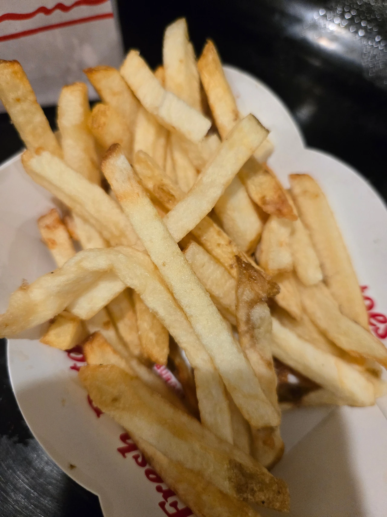 인앤아웃 오픈 주방 안에서는 일사 분란하게 움직이는 직원들 사이에서 마치 알라딘의 요술램프에 나오는 지니처럼 우람한 남자직원이 포테이토 프레시기를 자동기계처럼 움직인다. 육중한 팔의 힘으로 누르면 감자가 잘려 나온다. in -n-out의 후라이 포테이토 맛이 좋은 건 바로 생감자를 잘라 바로 튀겨주는데 이유가 있는 것이다. 그래서인지 인위적이지 않은 감자 본연의 맛을 제공한다. 다들 알 것이다. 감자를 바로 튀겨 주면 얼마나 맛있는지ᆢ