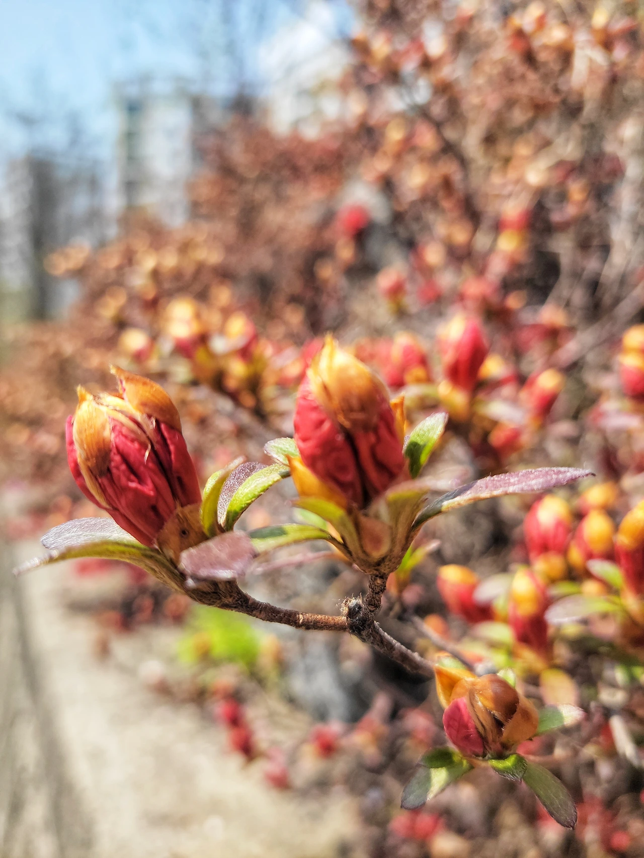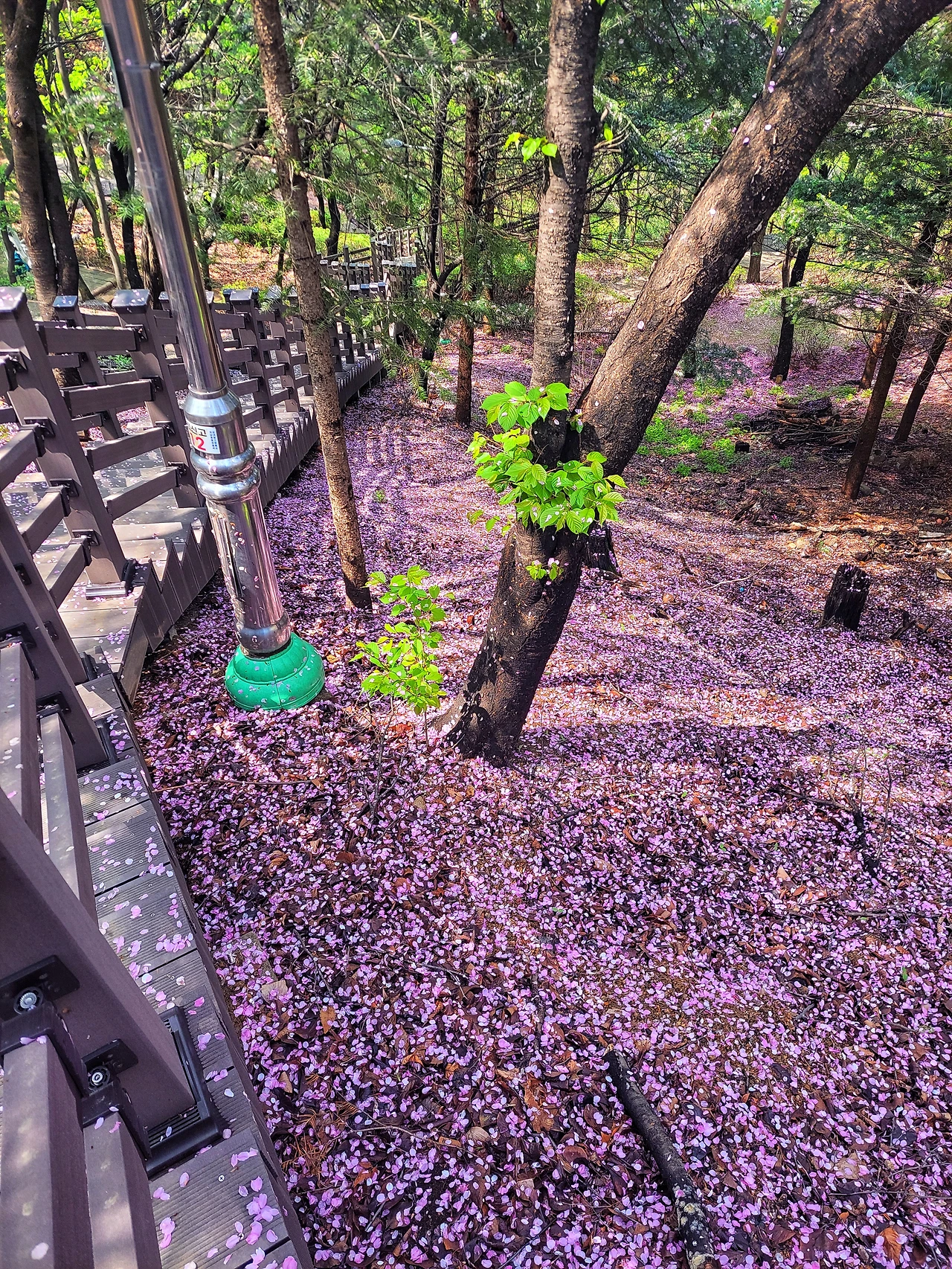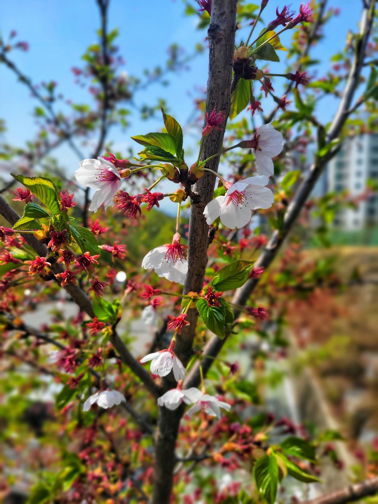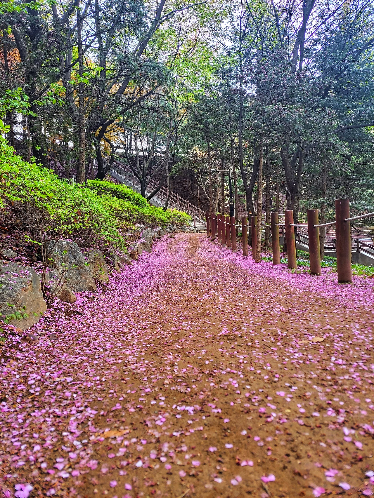 꽃잎이 지나고 난 자리에 초록빛 새순이 소리 없이 하나둘씩 인사를 건넨다. 고목의 시간 위를 핑크빛 이불까지 덤으로 남기고 간 자리에 살포시 나의 숨결도 얹어 보았다.