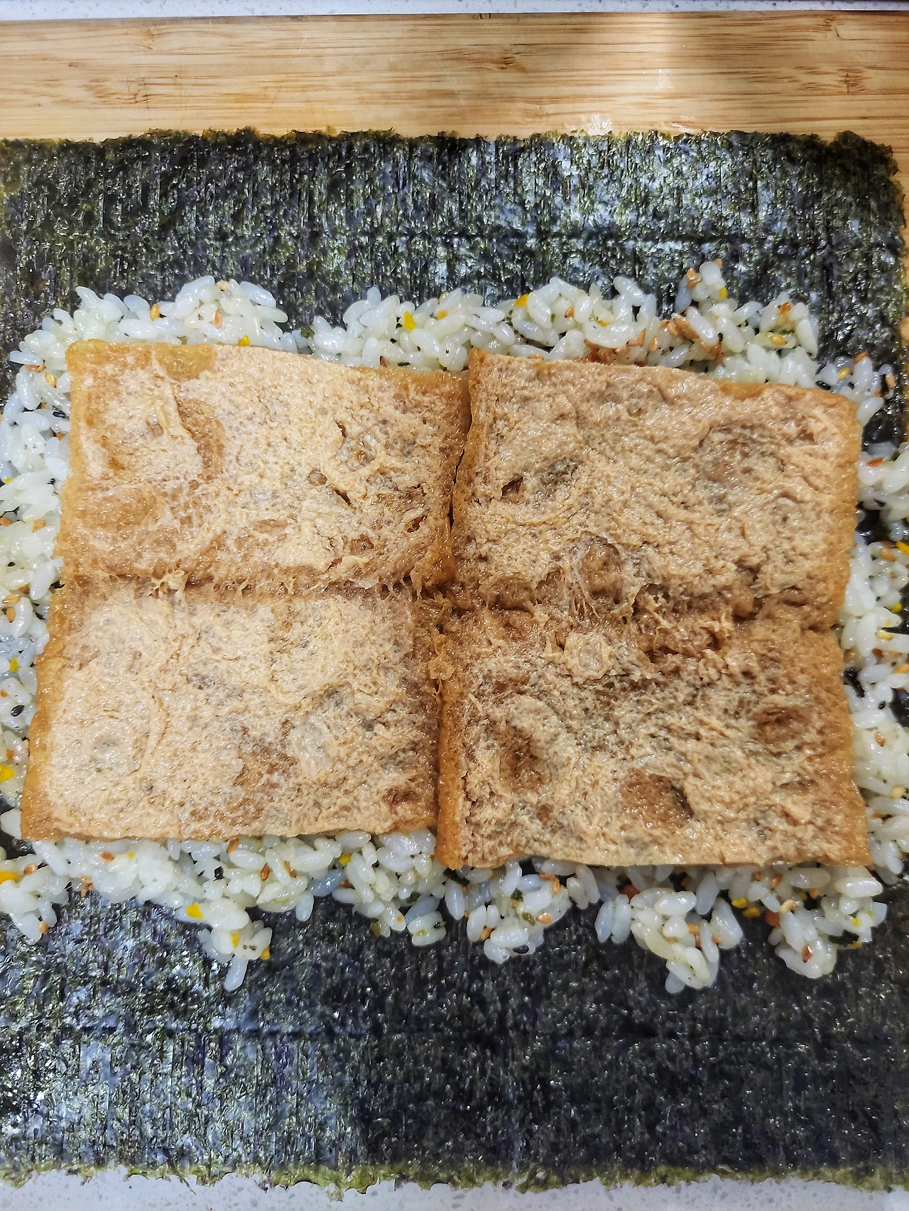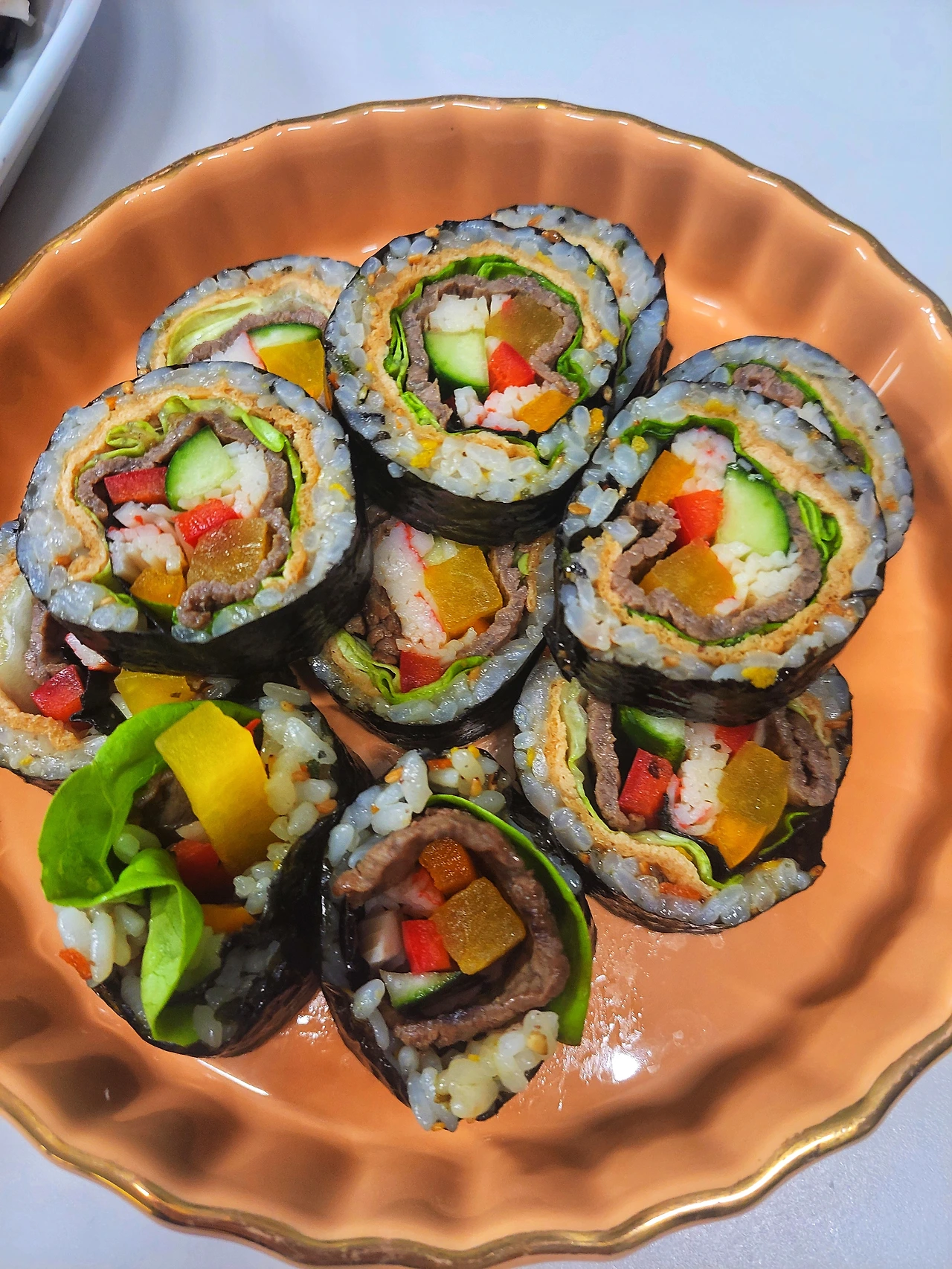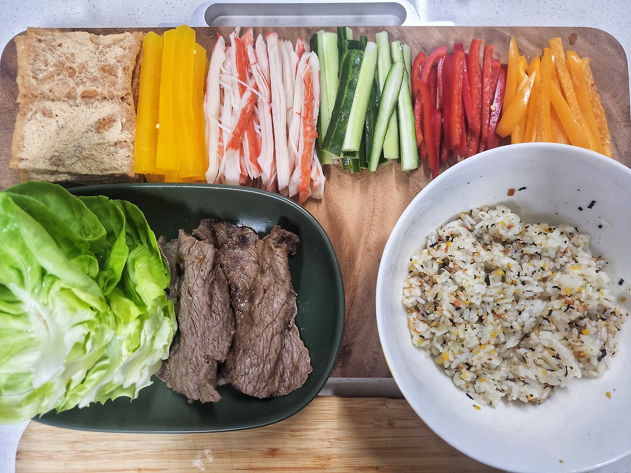 마트에 한우 할인행사를 많이 하고 있는 우둔살을 집어 왔다. 불고기감으로 얇게 썰려 있었지만 혹시 몰라 칼등으로 자근자근 두드려 준 뒤 진한 불고기 양념을 했다. 아침에는 양파와 파프리카를 채 썰어 넣고 새송이 버섯을 채 썰어 불고기 덮밥으로, 저녁에는 남겨둔 불고기를 넣고 유부초밥과 김밥말이 두 가지 콘셉트로 만들었다.