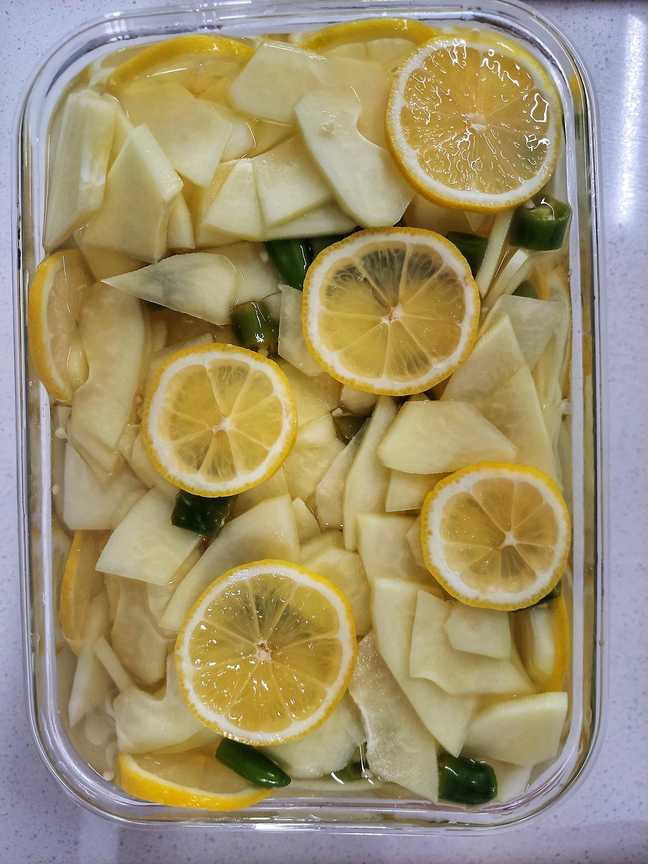 엊그제 도착한 제주 유기농 그린파파야로 피클을 담았다. 매콤한 쥐똥 고추가 없어 아쉬운대로 건고추로 대신했다. 그나마 레몬이라도 있어 다행이었다.