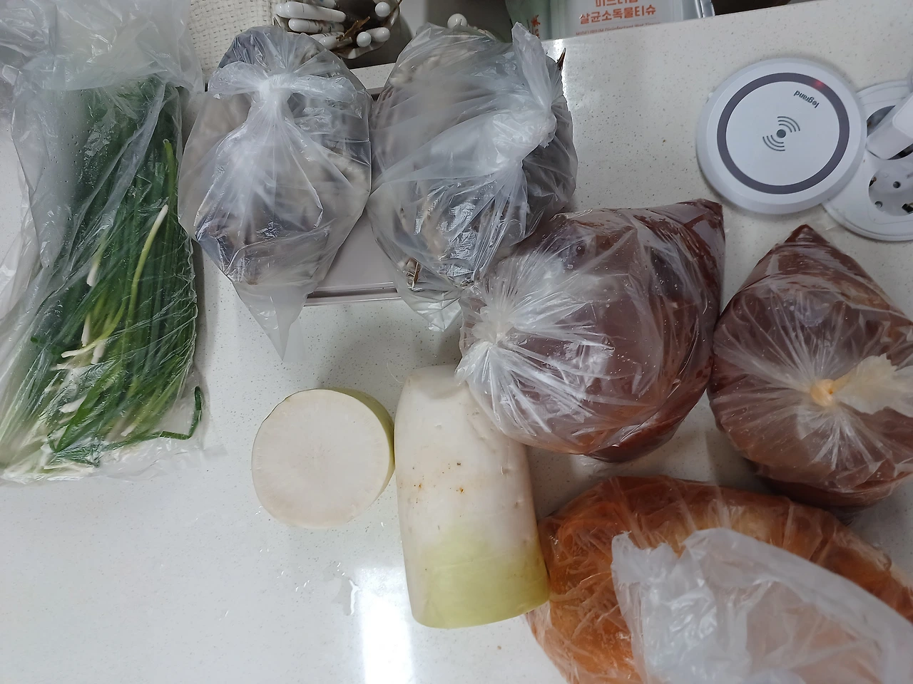 그리고 도착한 엄마표 반찬들과 생선들, 그리고 아버지가 농사지은 작물들까지 20킬로 박스 두 개가 왔다.