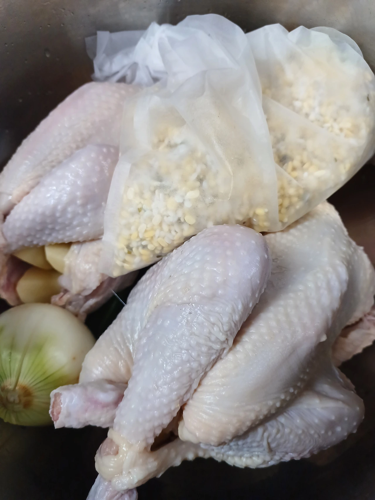 불린 찹쌀과 녹두를 담은 베보자기를 싸매고 익어가는 닭백숙 옆에 넣으셨다.