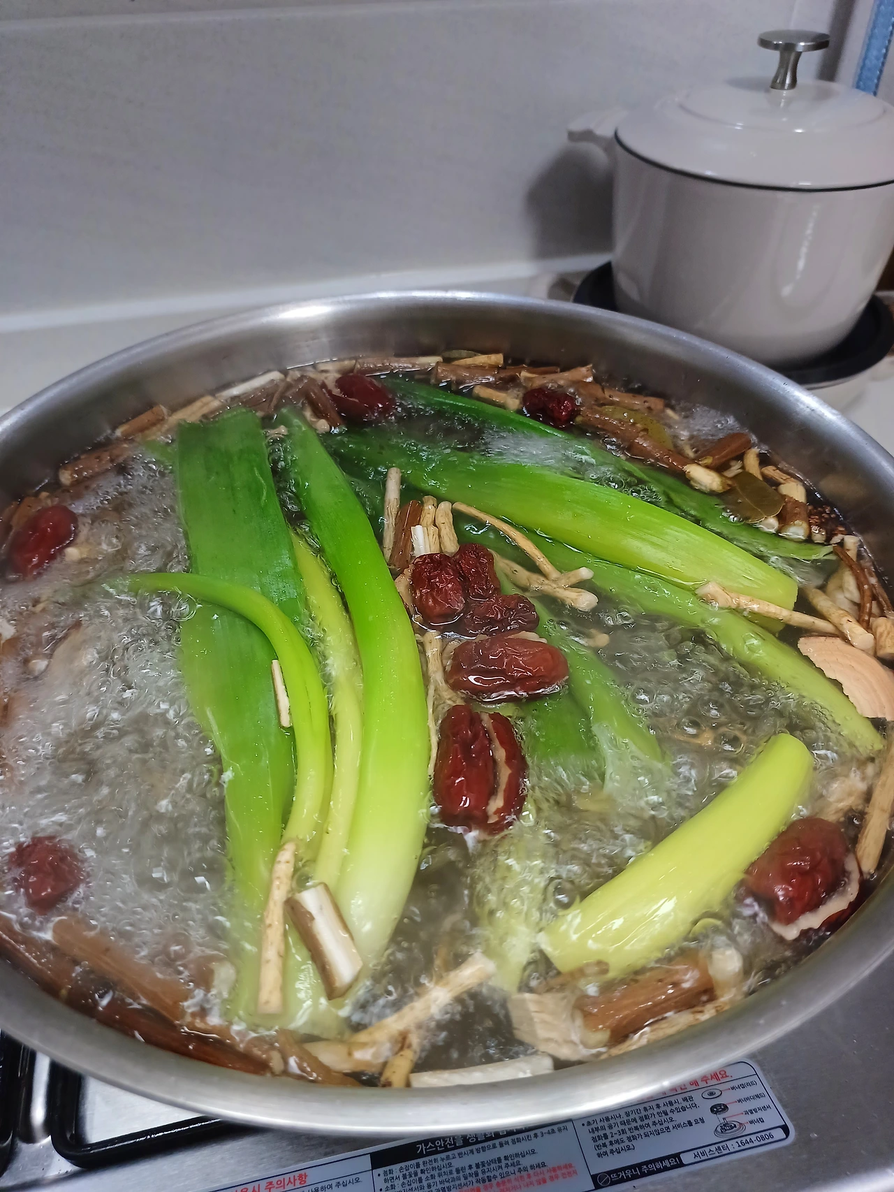 먼저 토종닭에 함께 포장되어 있던 한방 재료와 대파 몇 뿌리, 생강을 넣고 충분히 끓여 육수를 낸다. 닭의 똥꼬 지방도 말끔히 제거하고 배 속 내장 찌꺼기와 남아있는 잔여물들도 젓가락으로 파내어 깨끗하게 손질해 준다. 그렇지 않으면 닭 비린내가 나기 쉽다. 손질한 토종닭 배 안에 할머니가 만들었던 것처럼 통마늘로 반쯤 채우고 토막썰은 감자도 넣어 채운다. 그리고는 닭다리로 야무지게 여며 모양을 잡아준 뒤 끓이고 있는 육수에 한방 재료를 모두 건져내고 황기 한 줌과 구기자 두어 줌 , 그리고 씨 뺀 대추 10알 정도 넣어 주었다. 중간쯤 불린 찹쌀과 녹두 주머니를 넣고 1시간 반 정도 끓여 주었다. 그 사이 알배추 겉절이를 만들고 아들을 맞이할 준비를 끝냈다.