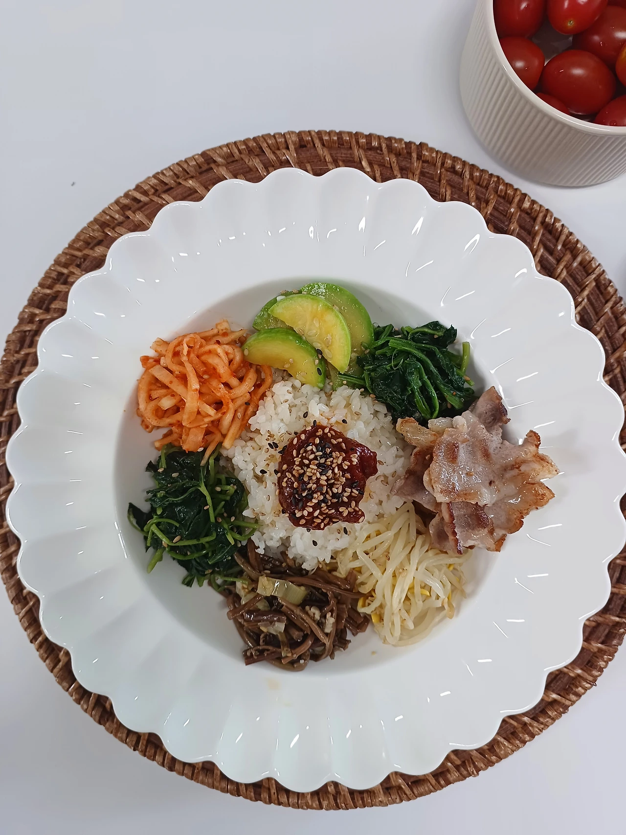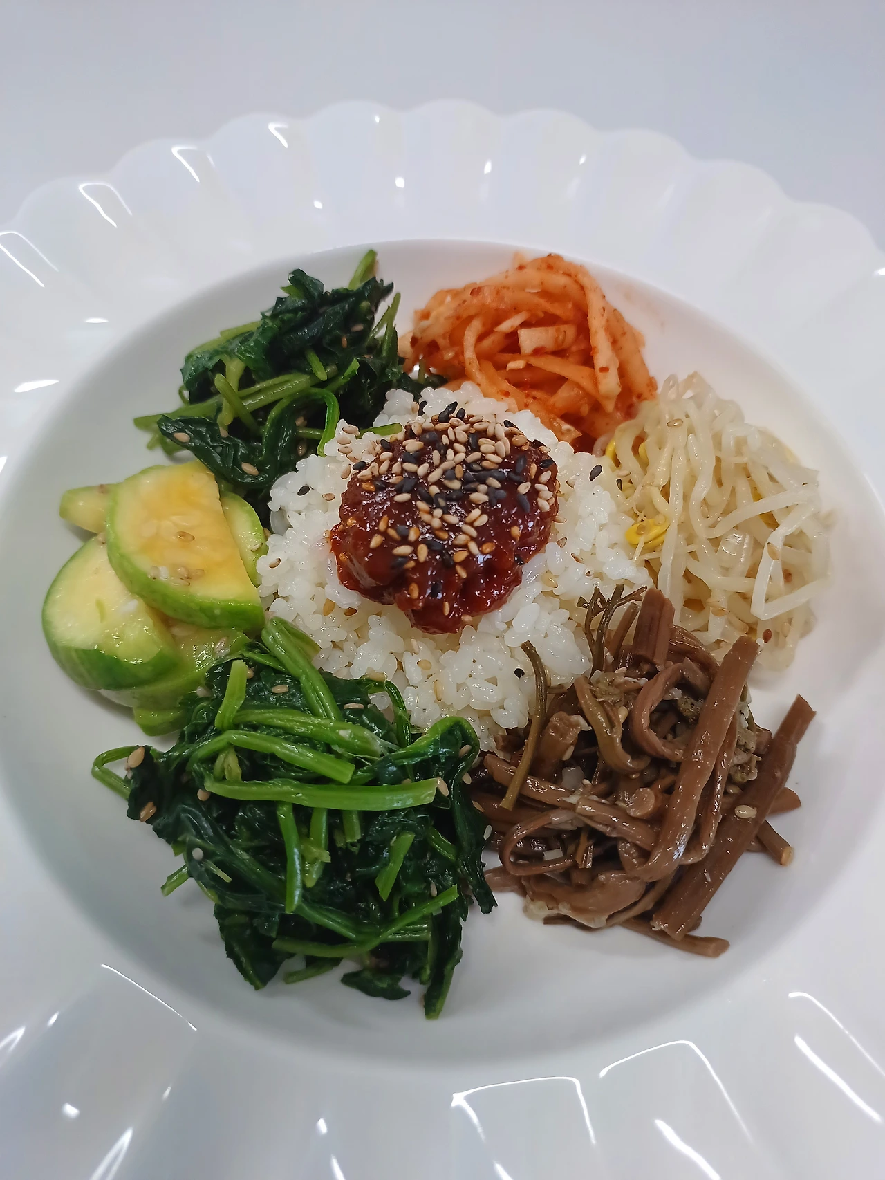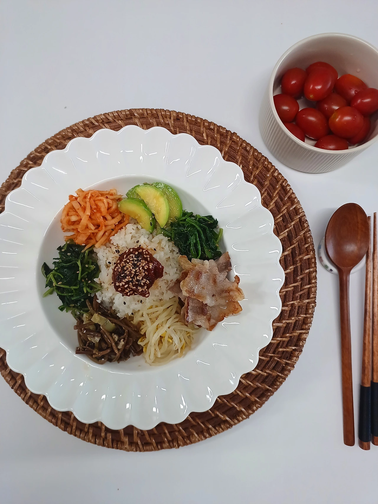 점심에 비빔밥으로 한 끼를 대신했다. 내가 먹을 비빔밥 그릇엔 나물만, 아들에게는 얇은 대패 삼겹살 몇 점을 고소하게 구워 다른 나물들과 함께 담았다.