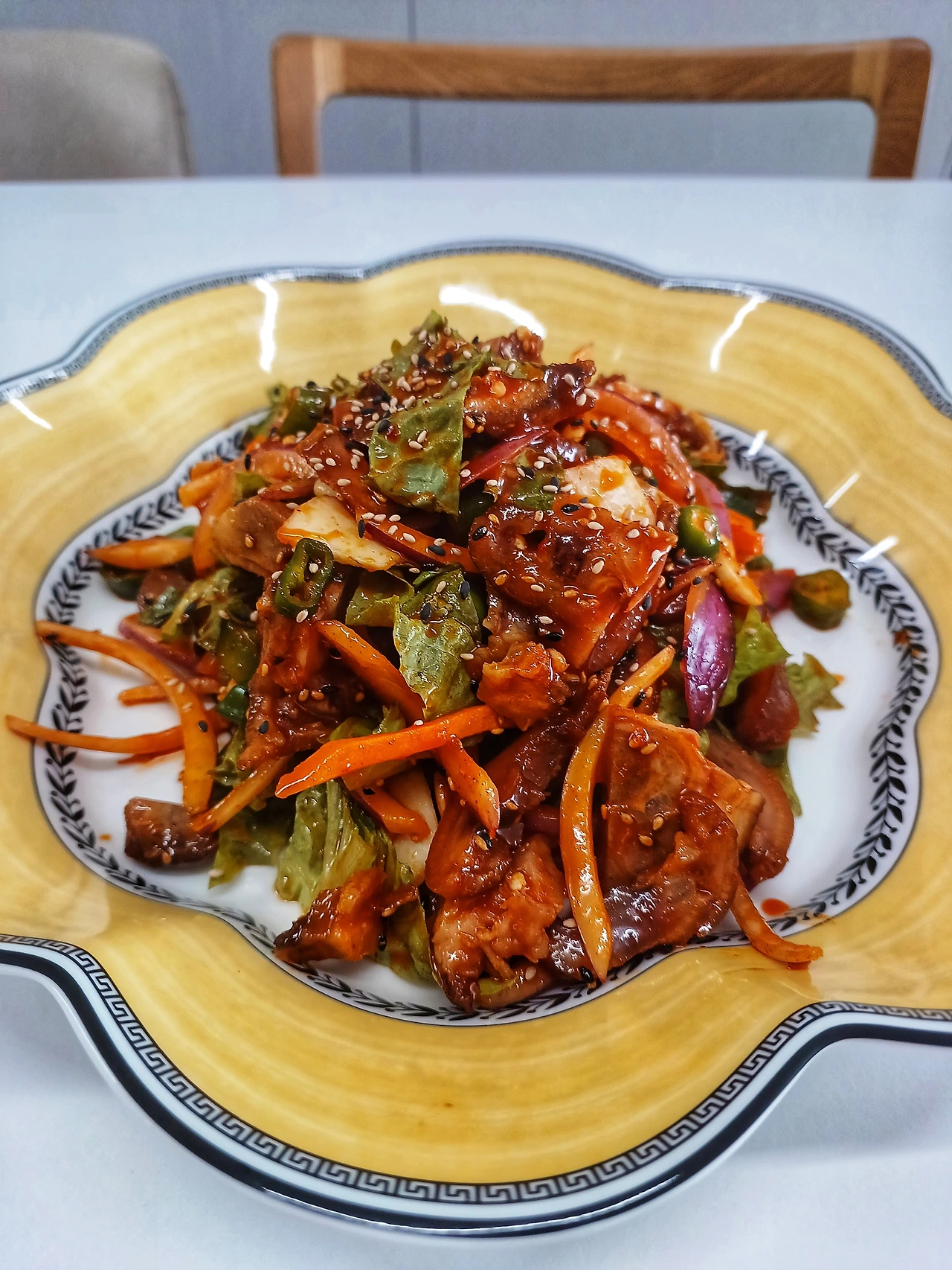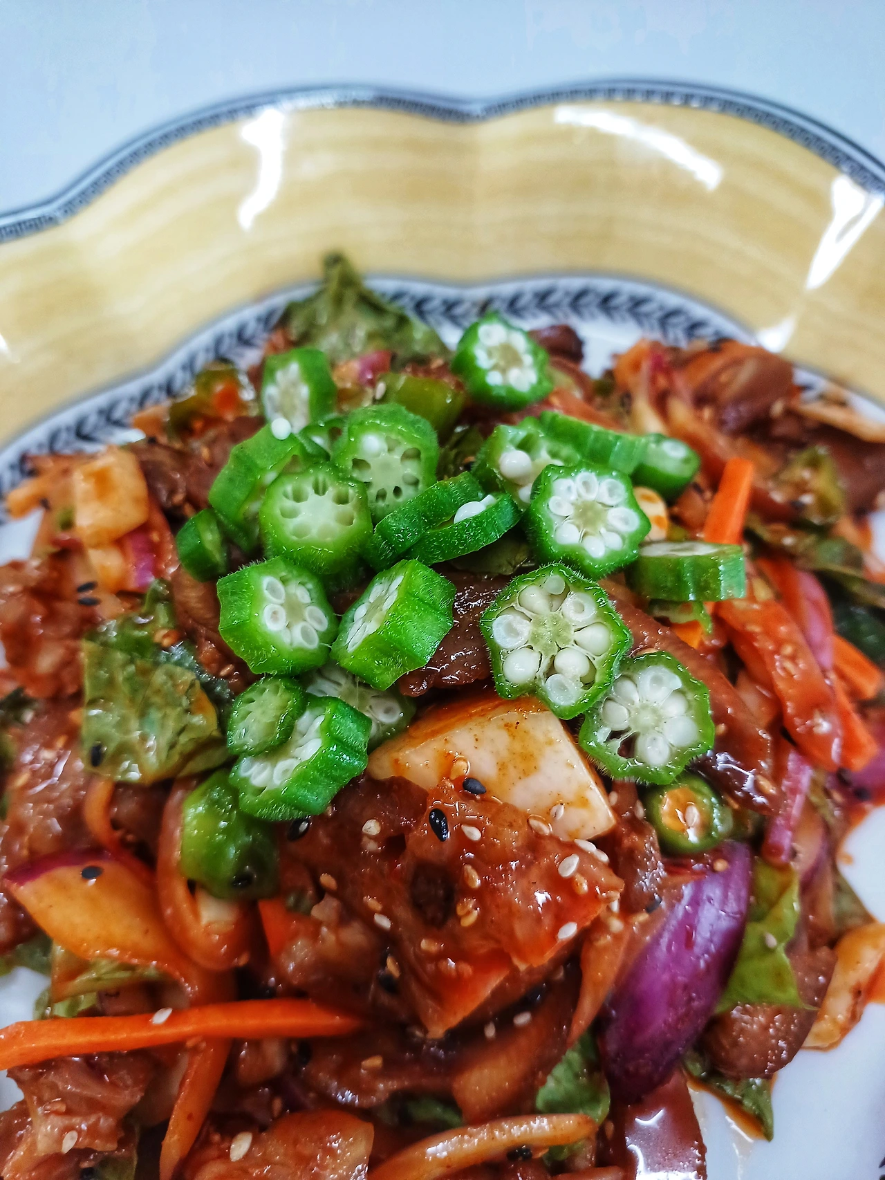 족발집에서 포장할 때 챙겨 준 마늘과 청양고추, 요즘 고공 행진 중인 야채 값에 금추라 불리는 상추를 잘라 넣고 집에 있는 적양파와 당근채를 넣어 매콤 새콤하게 무쳐서 접시에 담아내고 아침에 손질해 둔 오크라를 올렸죠.