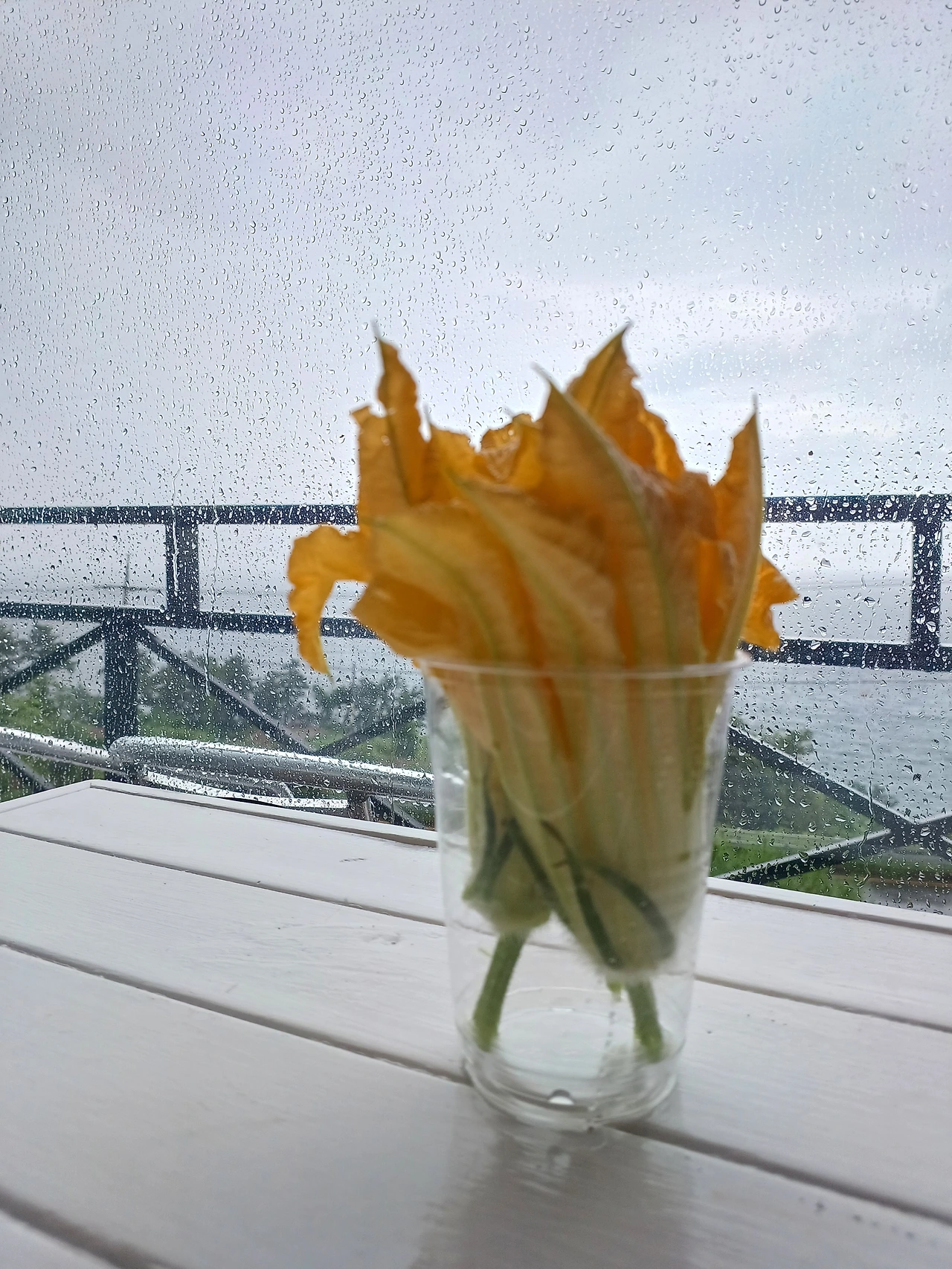 정겹게 자리 잡은 텃밭에 호박꽃이 보여 펜션 쥔장께 허락을 구하고 해처럼 환하게 웃는 호박꽃을 골라 몇 송이 따왔다. 어릴 때 할머니가 해주셨던 호박꽃 전을 부쳐 보고 싶었다.