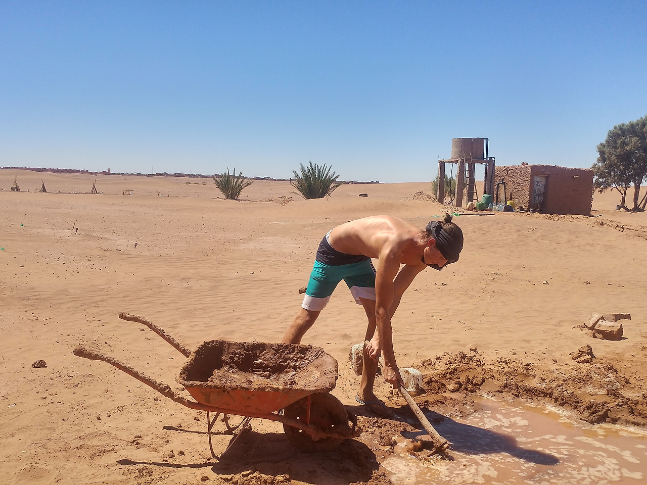 몇 발짝 걸어 다른 흙집 앞에 도착하니 땅속에 깊게 파인 우물이 있었다. 아흐마드는 기계와 호스를 이용하여 물을 끌어올린 뒤, 큼지막한 플라스틱 통들에 가득 채웠다. 화장실을 이용할 때 쓰일 물이었다. 직접 물을 부어 용변을 처리해야 하는 수동 변기뿐만 아니라 샤워기를 사용할 때도 같은 물이 활용되었다. 전혀 여과되지 않은 물이 그대로 샤워기에 연결되기 때문에, 샤워를 마친 후에도 몸에 소금기가 남을 수밖에 없었다. 화장실 그리고 샤워 부스를 위한 물을 모두 채운 뒤에는 물이 뿜어져 나오는 호스를 바닥에 내려놓고, 사면을 따라 흐르는 물이 작은 웅덩이를 이룰 때까지 그대로 두었다. 아흐마드가 오늘 할 작업을 설명했다.