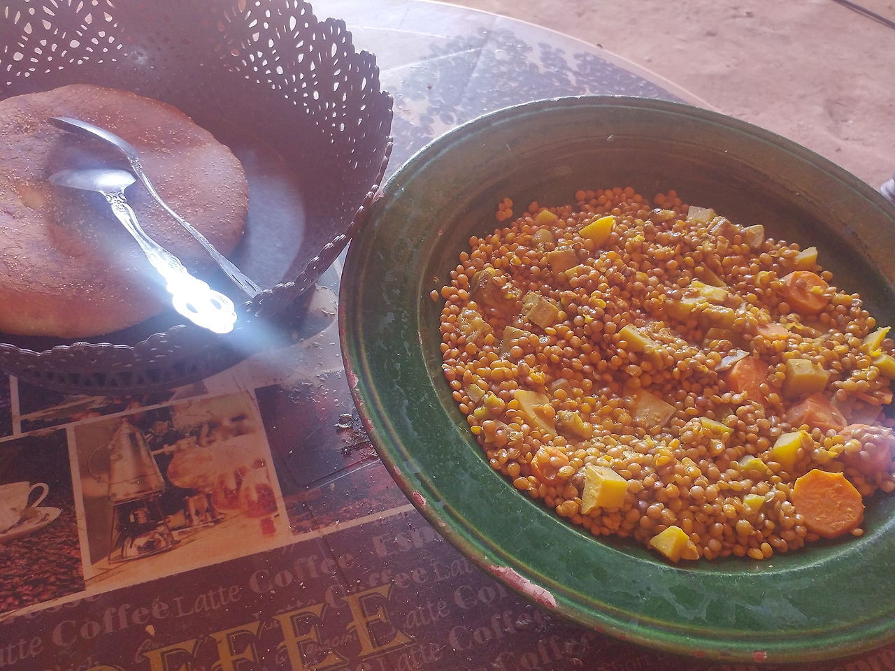 숨을 헐떡이며 작업을 마치자, 아흐마드가 점심 식사를 차려 주었다. 할당된 일은 점심 이전까지만 하면 되었고, 그 이후로는 자유롭게 시간을 보낼 수 있었다. 우리의 첫 점심 식사는 호박과 함께 삶아낸 잠두콩이었다. 빵을 가른 뒤 속에 콩을 채워 여러 번 먹었다.