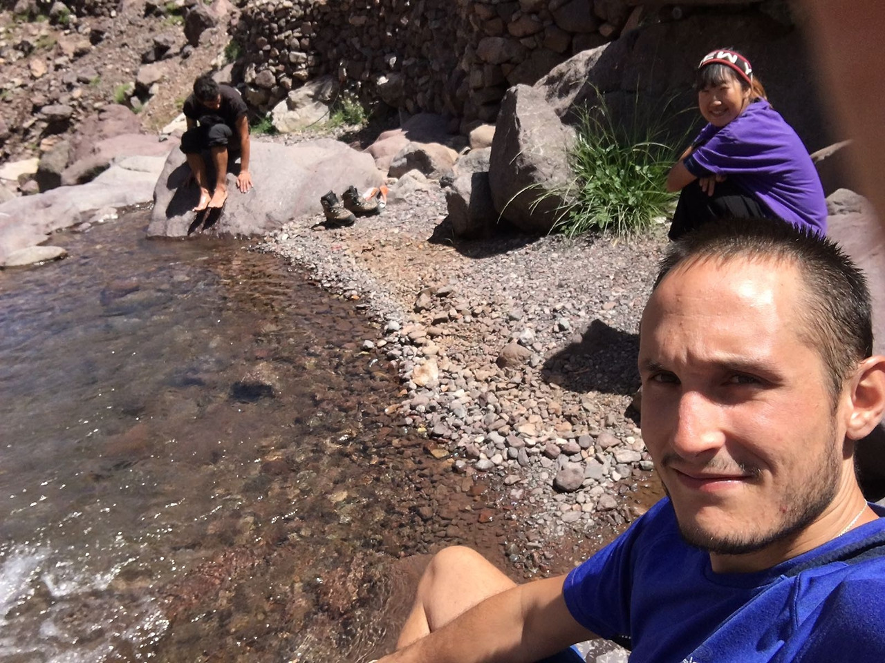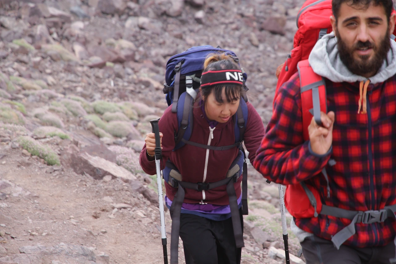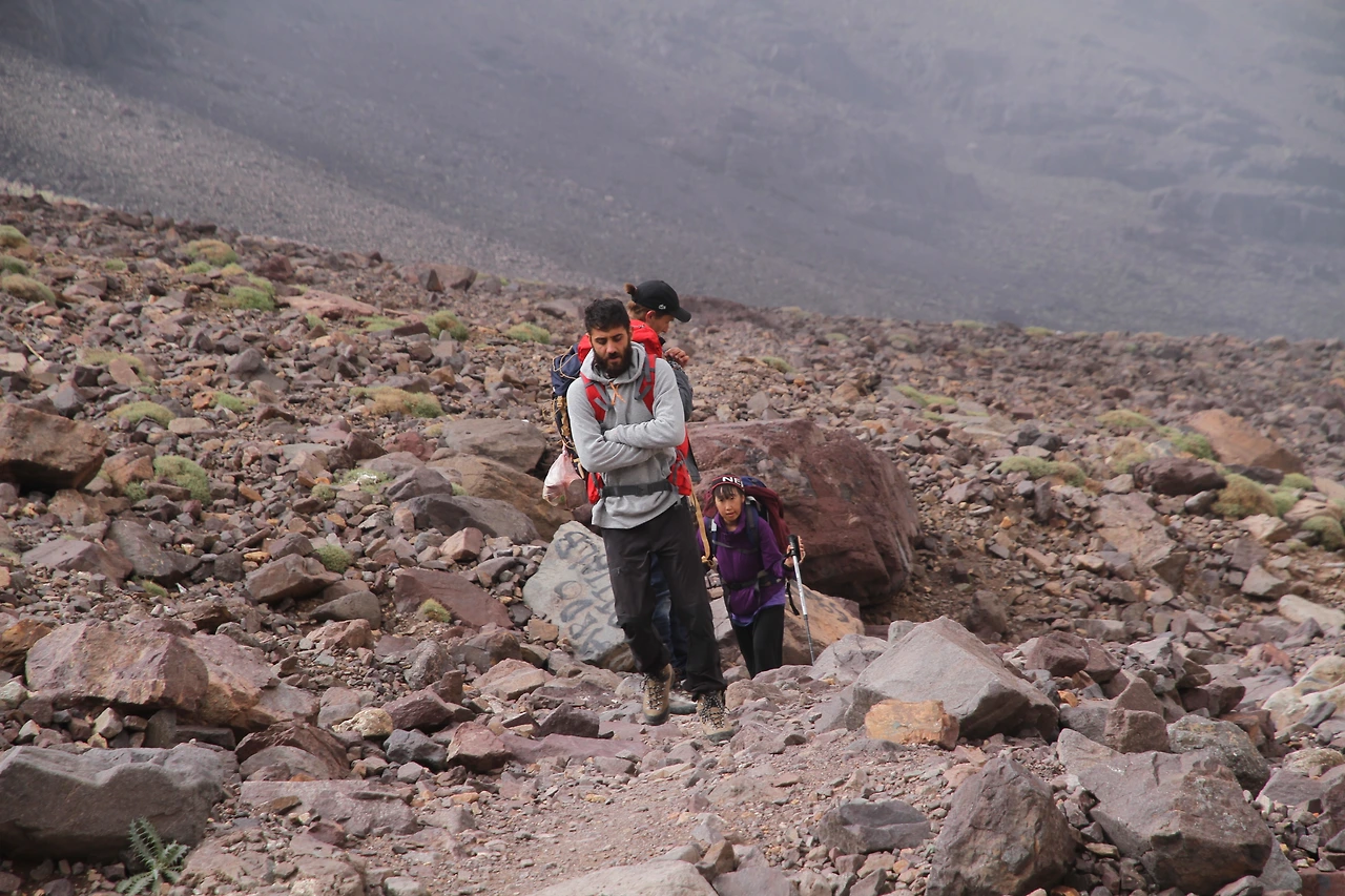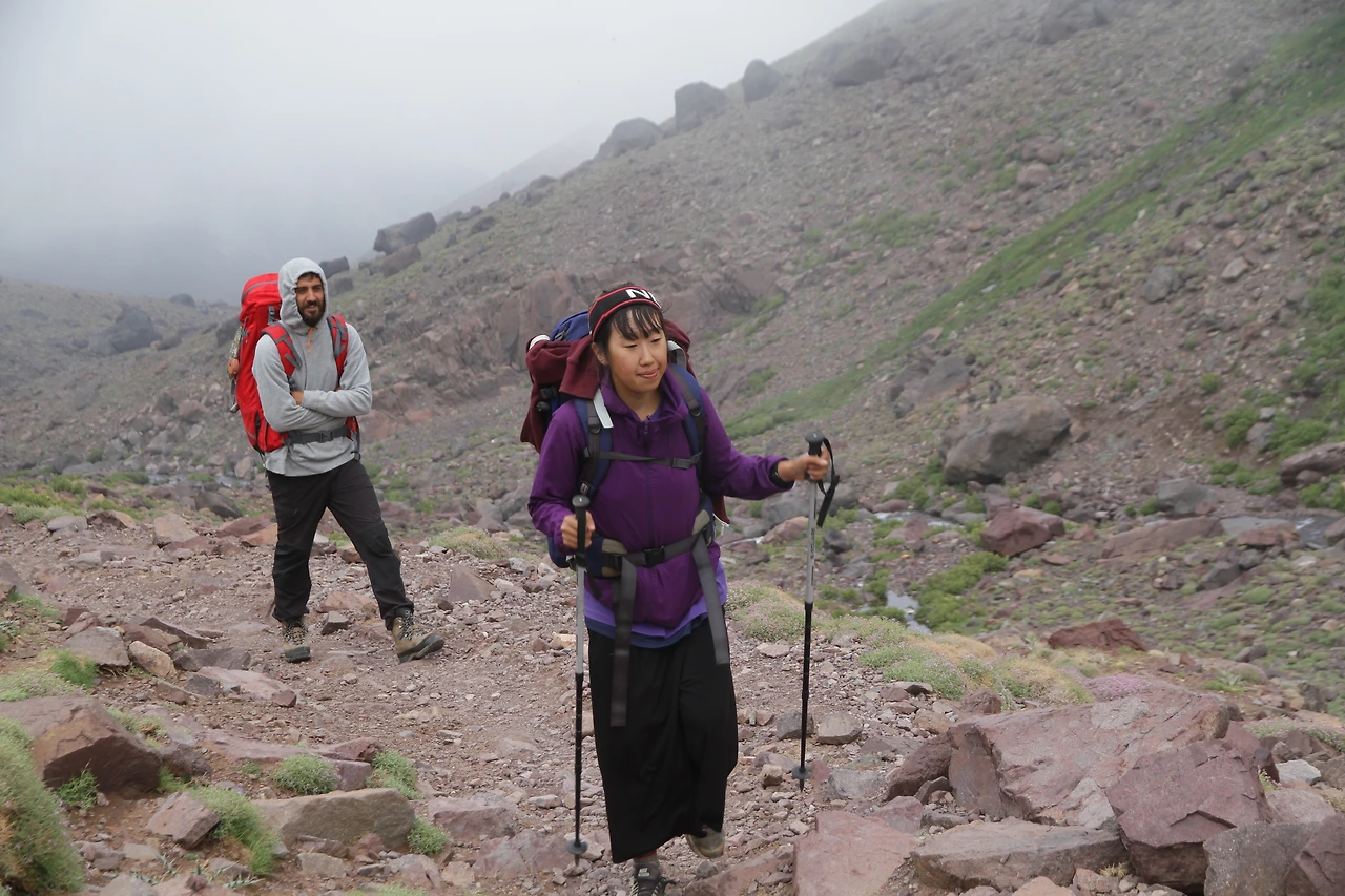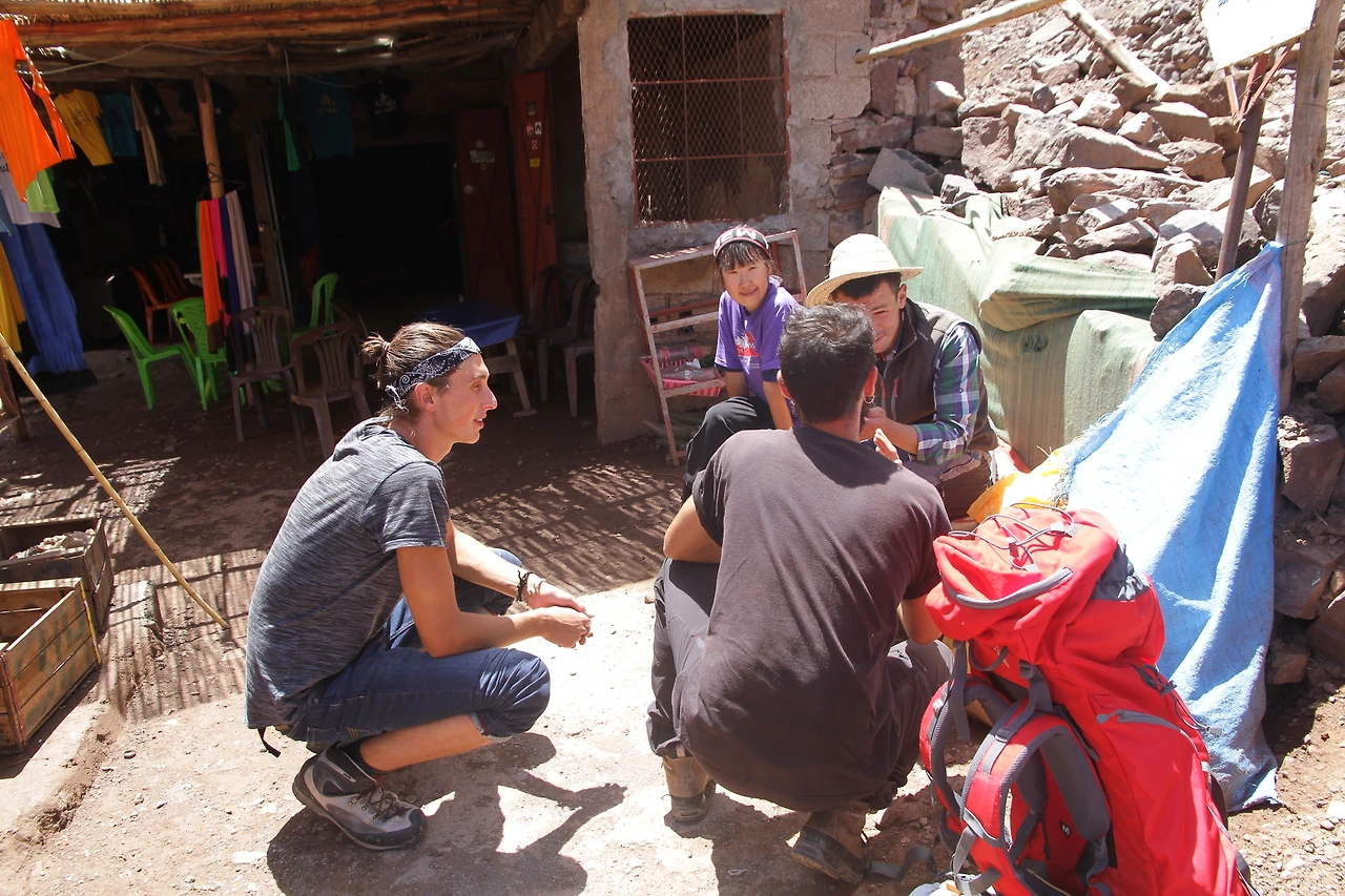 길은 세계 각국에서 온 등산객들로 넘쳐났다. 개중에는 전날 마을에서 만나 이미 친분을 쌓은 친구들도 있었다. 비교적 평탄한 길을 따라가다 보면 꼭대기까지 굉장히 가파른 경사로 이어지는 구간이 나오는데, 이 구간에 접어들기 바로 전인 약 3,200m 지점에 두 채의 산장이 있었다. 우리가 목표로 둔 투브칼 봉우리(Djebel Toubkal)는 산장을 지나 4,167m 지점에 있었다.