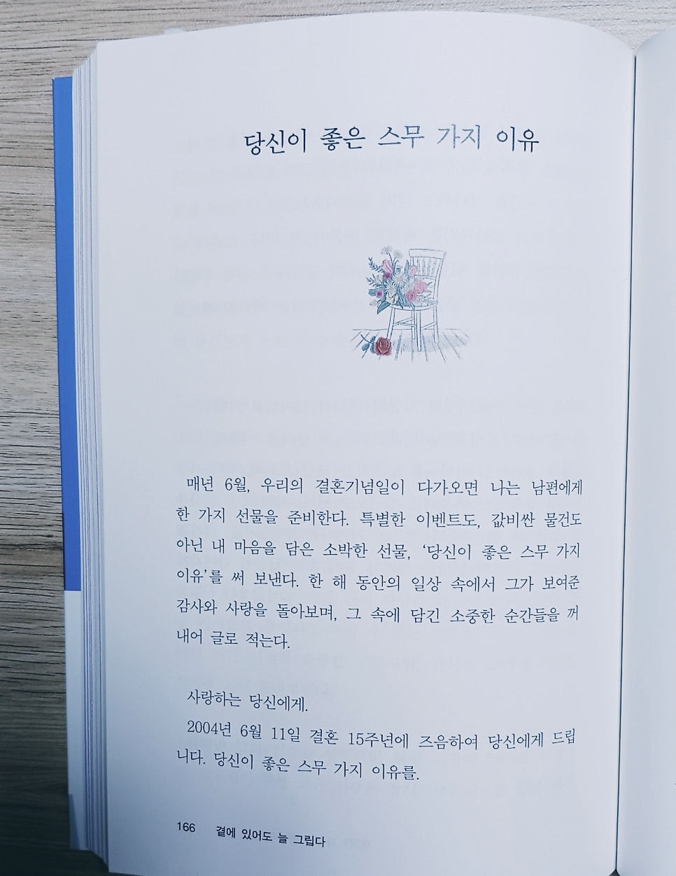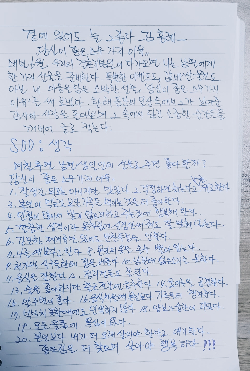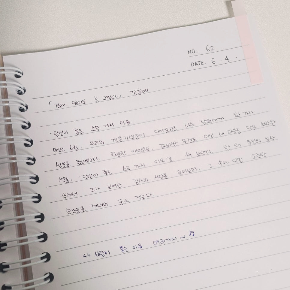 매년 6월, 우리의 결혼기념일이 다가오면 나는 남편에게 한 가지 선물을 준비한다. 특별한 이벤트도, 값비싼 물건도 아닌 내 마음을 담은 소박한 선물, '당신이 좋은 20가지 이유'를 써 보낸다. 한 해 동안의 일상 속에서 그가 보여준 감사와 사랑을 돌아보며 그 속에 담긴 소중한 순간들을 꺼내어 글로 적는다.