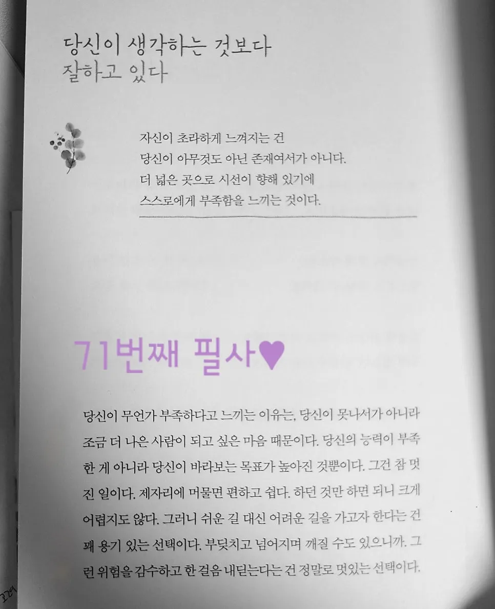 당신이 무언가 부족하다고 느끼는 이유는 당신이 못나서가 아니라 조금 더 나은 사람이 되고 싶은 마음 때문이다. 당신의 능력이 부족한 게 아니라 당신이 바라보는 목표가 높아진 것뿐이다. 그건 참 멋진 일이다.
