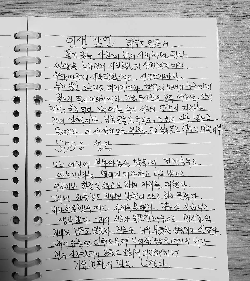 요즘엔 다투었을 때 나의 잘잘못을 떠나서 내가 먼저 사과했더니 남편도 미안해하며 분위기가 좋아짐을 느꼈다.