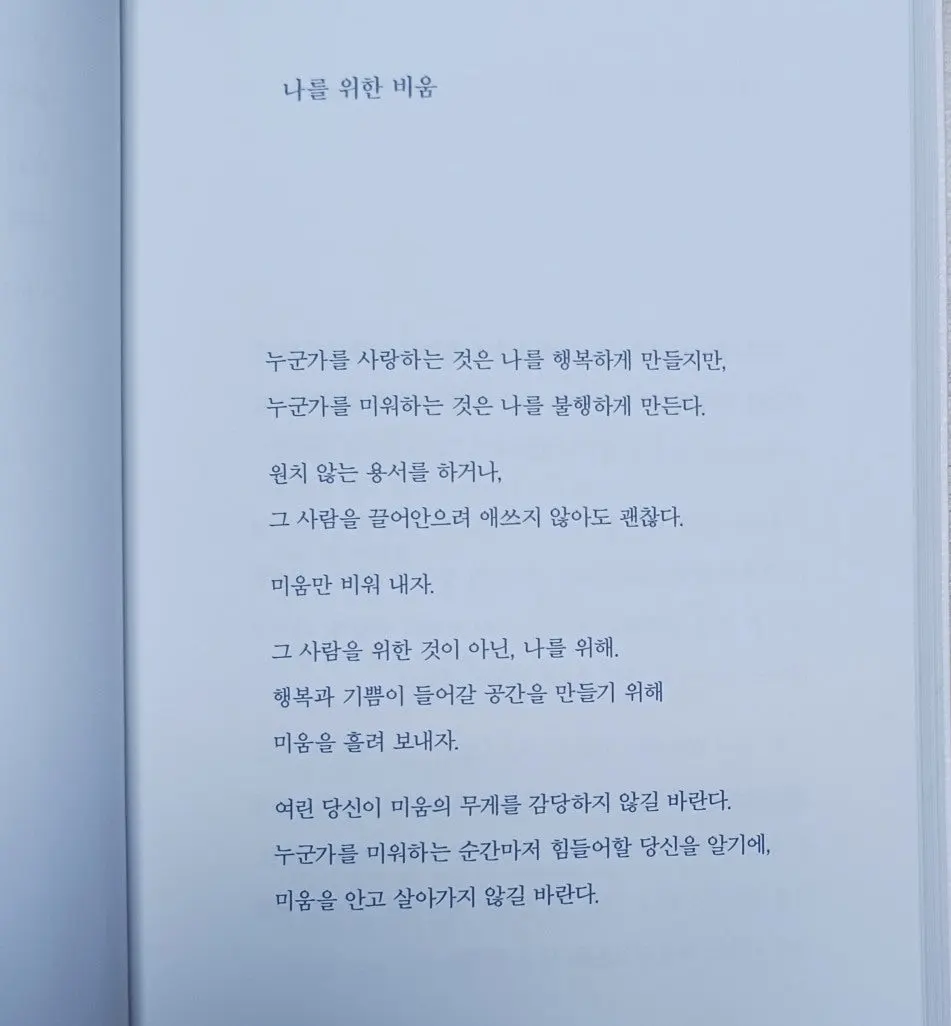 여린 당신이 미움의 무게를 감당하지 않길 바란다. 누군가를 미워하는 순간마저 힘들어할 당신을 알기에, 미움을 안고 살아가지 않길 바란다.