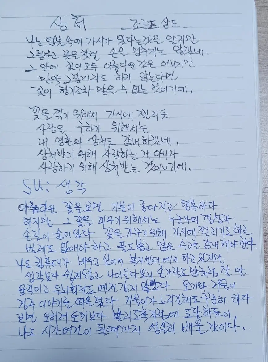 꽃을 가꾸기 위해 가시에 찔리기도 하고 벌레도 없애야 하고 풀도 뽑고 많은 수고를 감내해야 한다.