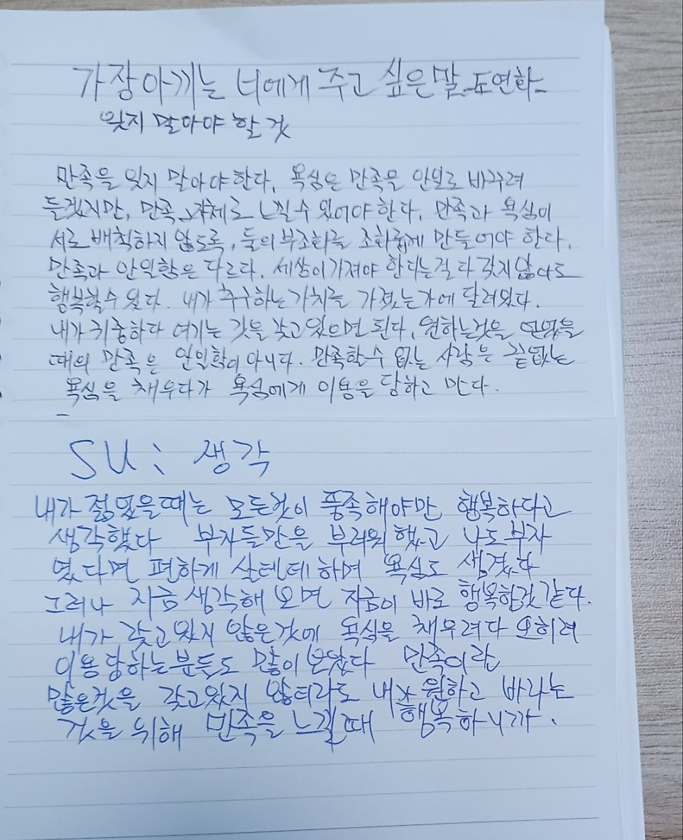 만족을 잊지 말아야 한다. 욕심은 만족을 안일로 바꾸려 들겠지만, 만족 그 자체로 느낄 수 있어야 한다. 만족과 욕심이 서로 배척하지 않도록 둘의 부조화를 조화롭게 만들어야 한다.