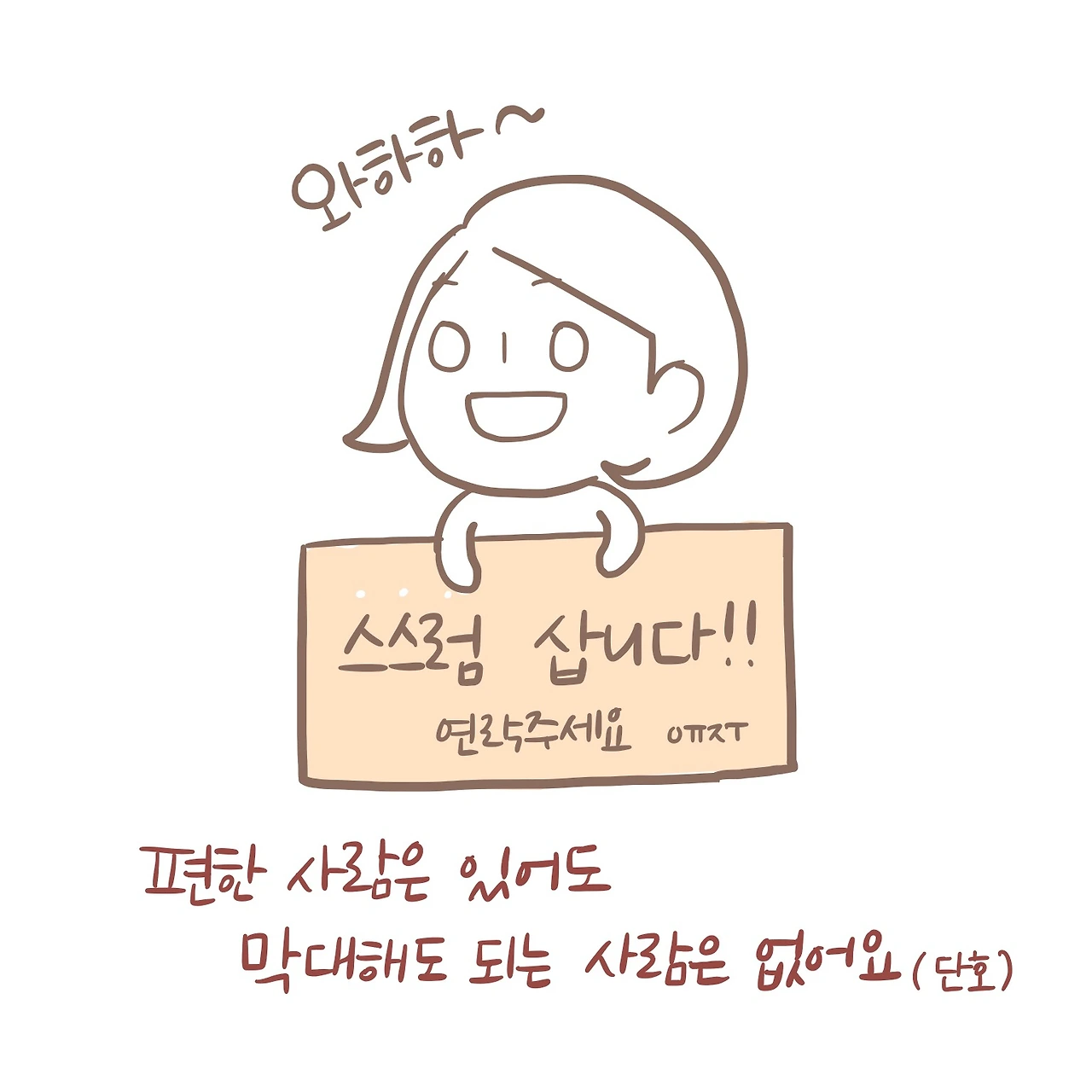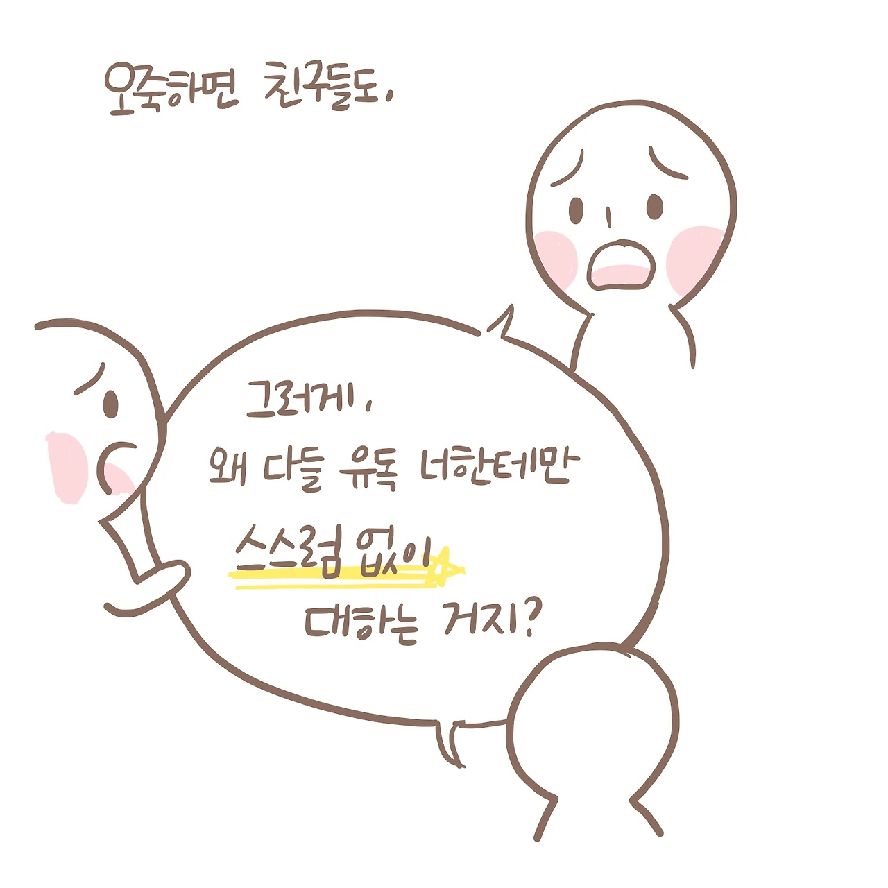 스스럼이 없는 것과 함부로 대하는 것은 분명 다를텐데. 친하다고 생각하면 왠지 막 대해도 될것 같다는 생각을 은연중에 하나보다.