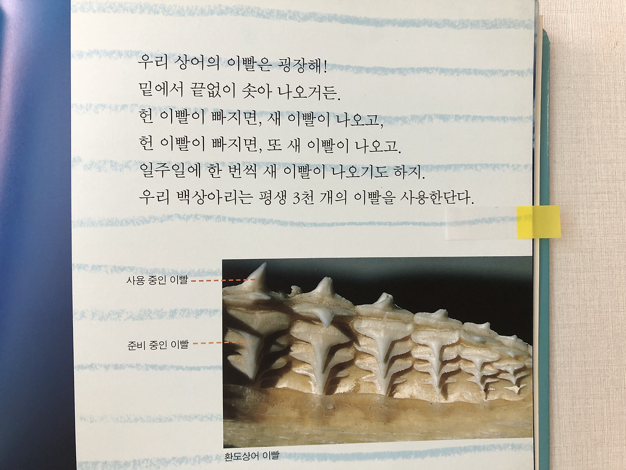 “우리 상어의 이빨은 굉장해! 밑에서 끝없이 솟아 나오거든. 헌 이빨이 빠지면, 새 이빨이 나오고, 헌 이빨이 빠지면, 또 새 이빨이 나오고. 일주일에 한 번씩 새 이빨이 나오기도 하지. 우리 백상아리는 평생 3천 개의 이빨을 사용한단다.”