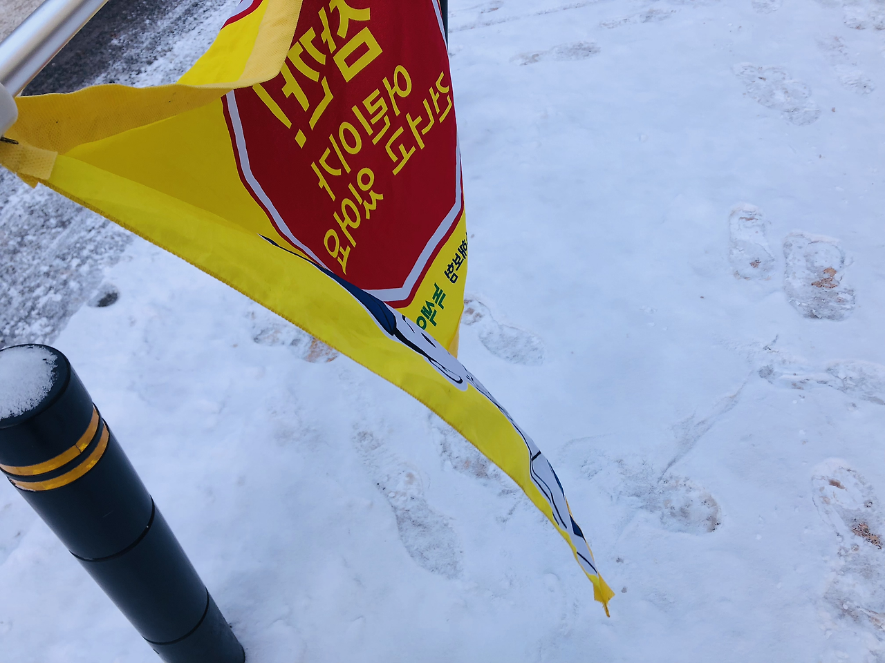 아침에 늦을까 봐 어제 미리 깃발도 챙겨놓았다. 나를 따라서 일찍 나오지 않아도 되는 아들은 굳이 함께 나왔다. 살을 파고들 추위를 걱정하며 바지를 두 개나 챙겨 입고, 상의는 4겹을 껴입었다. 엘리베이터를 타고 내려오는 내내 두꺼운 옷 때문인지 등줄기를 타고 땀이 흘렀다.