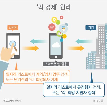 긱 경제가 일반 프리랜서와 다른 점은 모바일 안에 일정한 플랫폼을 두고 수익을 창출한다는 것이다. upwork가 해야 할 일이 있는 사람과 일이 필요한 사람을 연결해주고 이익을 얻는 것과 같다. 차량 공유 플랫폼 기업인 '우버'의 경우, 약 150만 명의 드라이버와 계약을 맺고 차량을 필요로 하는 고객과 연결해준다. 우리나라의 카카오 드라이버 역시 긱 경제에 속한다고 할 수 있다. 드라이버는 카카오와 계약을 맺고 운전을 원하는 고객이 있을 때, 일을 하고 수익을 얻는 형태이기 때문이다.