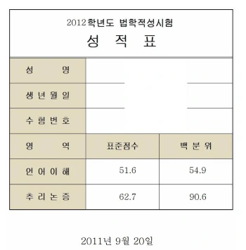 당시 표준점수로는 114.3점에서 139.2점으로 성적이 올랐다. 2019년에 치러진 2020학년도 시험부터는 언어이해에는 0.9의 가중치를, 추리논증에는 1.2의 가중치를 각각 부여하는 방법으로 표준점수 산출방식이 변경되었는데, 백분위에 따라 현재의 표준점수 산출방식으로 환산해보면 약 122점에서 약 147점으로 점수가 올랐다. (표준점수 환산표는 다음 참조. 2009~2021 전개년 LEET(법학적성시험) 원점수 표준점수 백분위 환산표 모음 :: 유년기의 끝 (tistory.com)