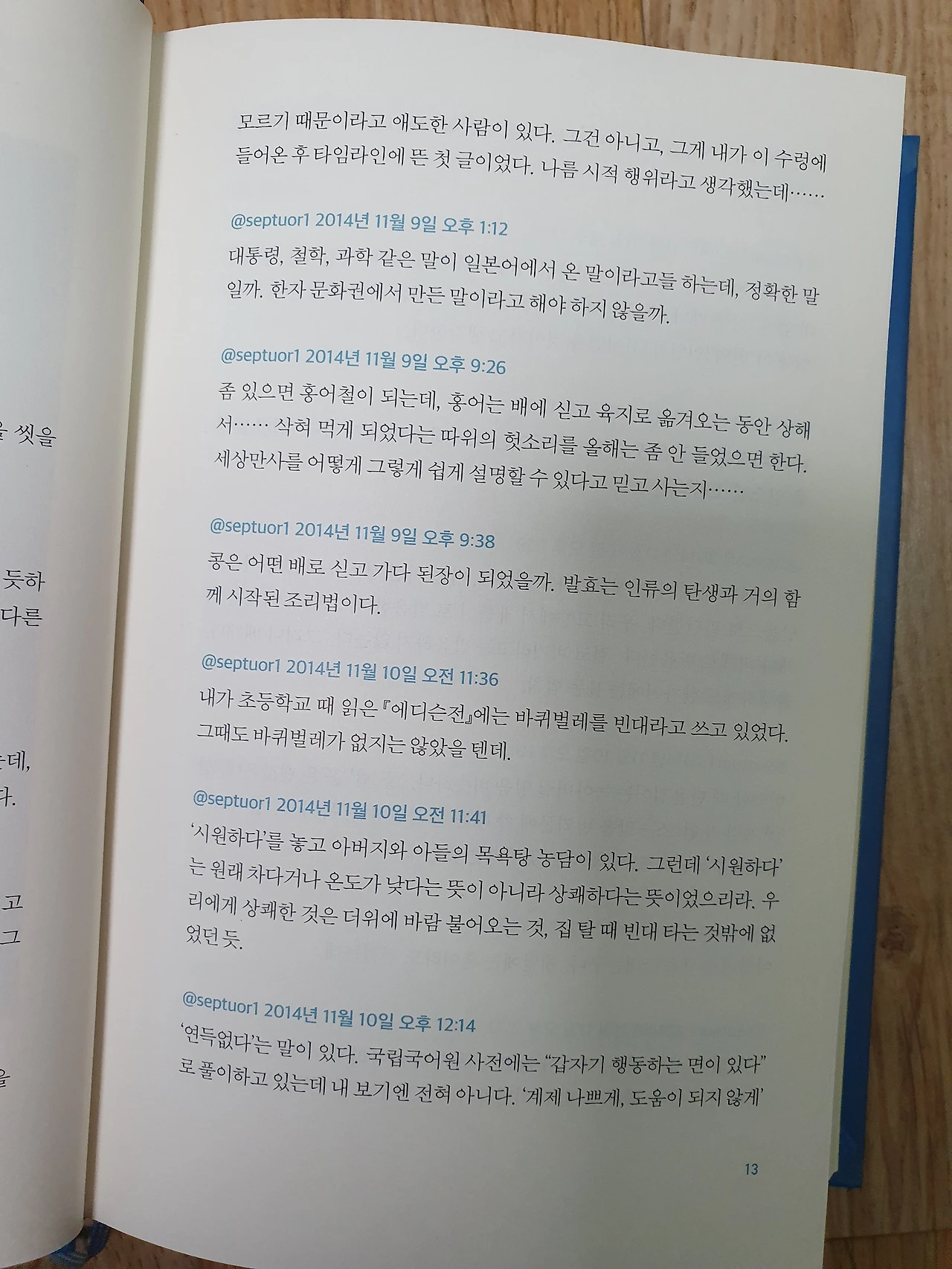 그의 책 중에 제일 두꺼운 '내가 모르는 것이 참 많다'는 그가 세상을 떠난 후 트윗에 남긴 글들을 모은 것이다. 구성도 트윗에 올린 것 그대로 되어있다.