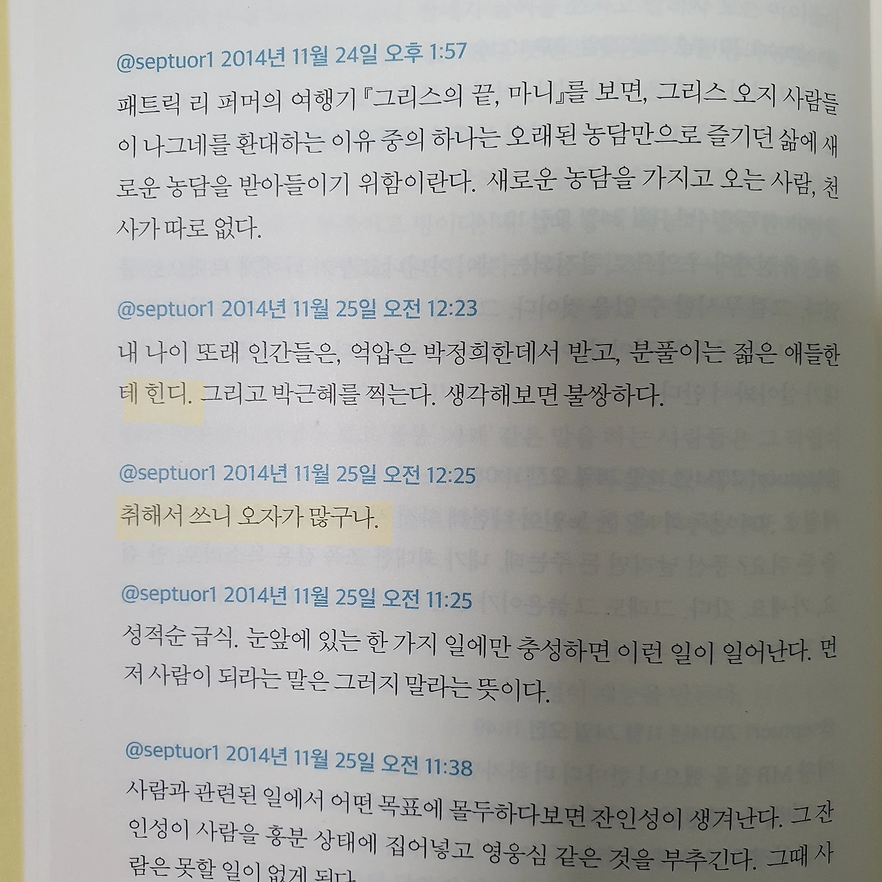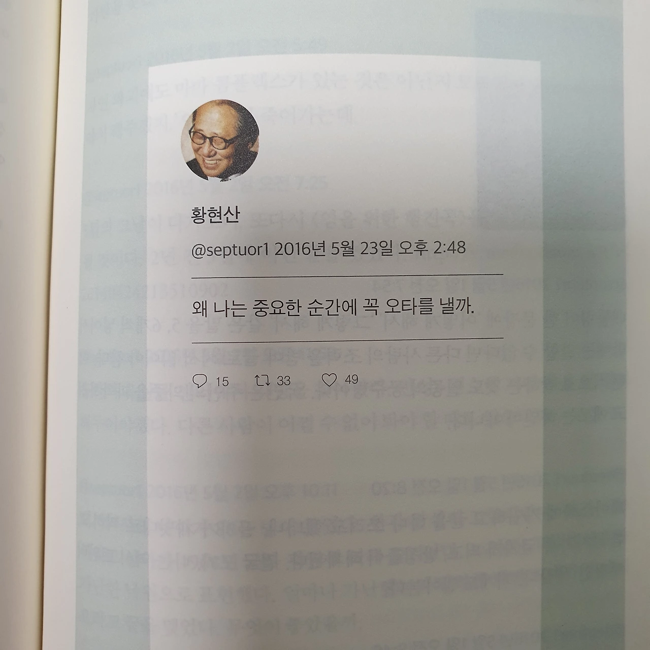 택배를 받자마자 쭈그려 앉아 그의 책을 뒤적이며 읽었다. 트윗을 한 세월만큼 읽어야 할 글들도 많지만 짧은 글들이라 호흡이 가벼웠다. 그리고 많은 사람들의 존경을 한 몸에 받던 사람도 오타를 내며 멋쩍어한 모습도 보여 웃음이 났다. 유머러스한 사람을 보면 긴장했던 마음이 풀리듯이 나도 황현산 님에게 가지고 있었던 편견과 어려움이 조금 누그러지는 듯하여 기분이 좋았다.