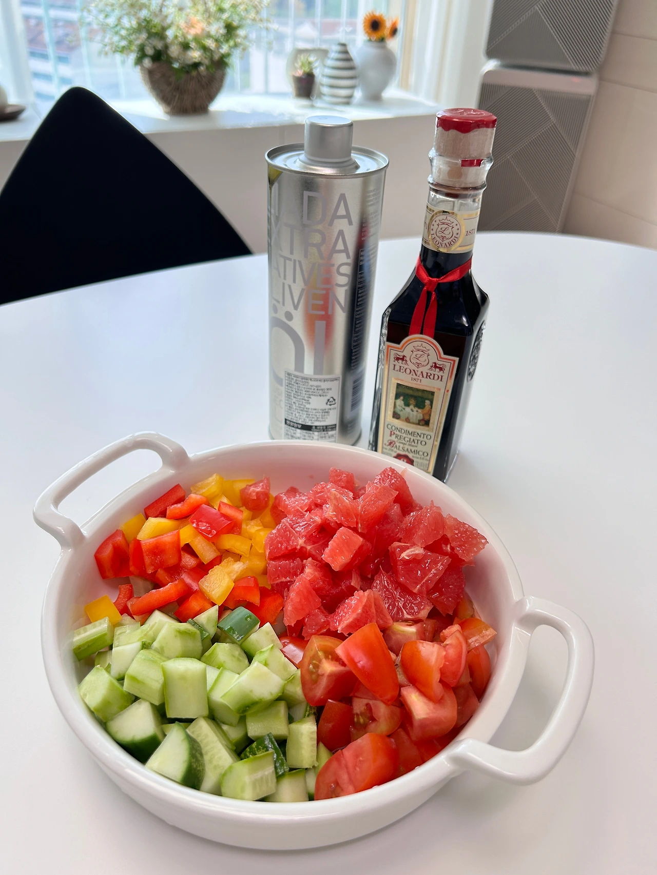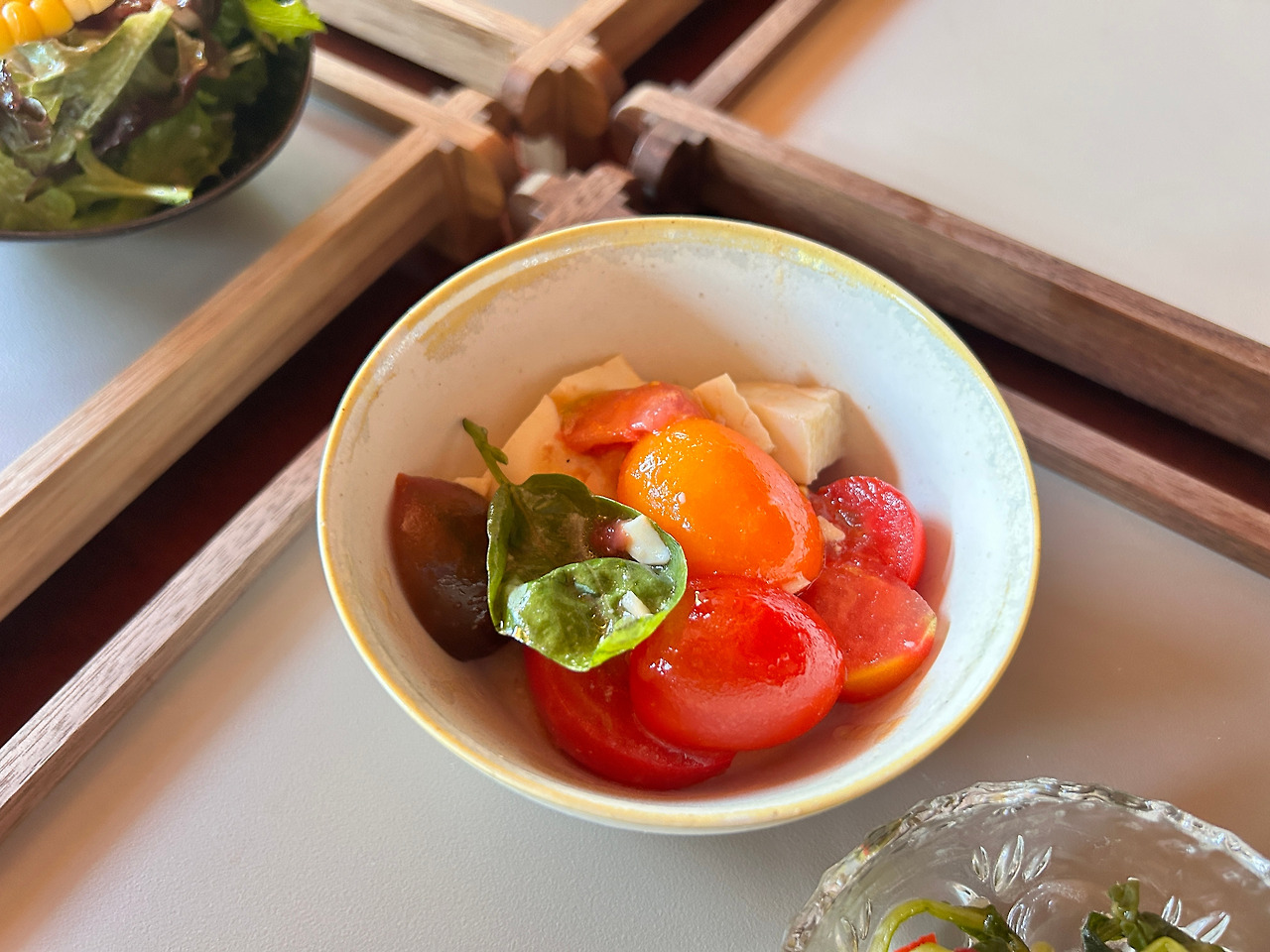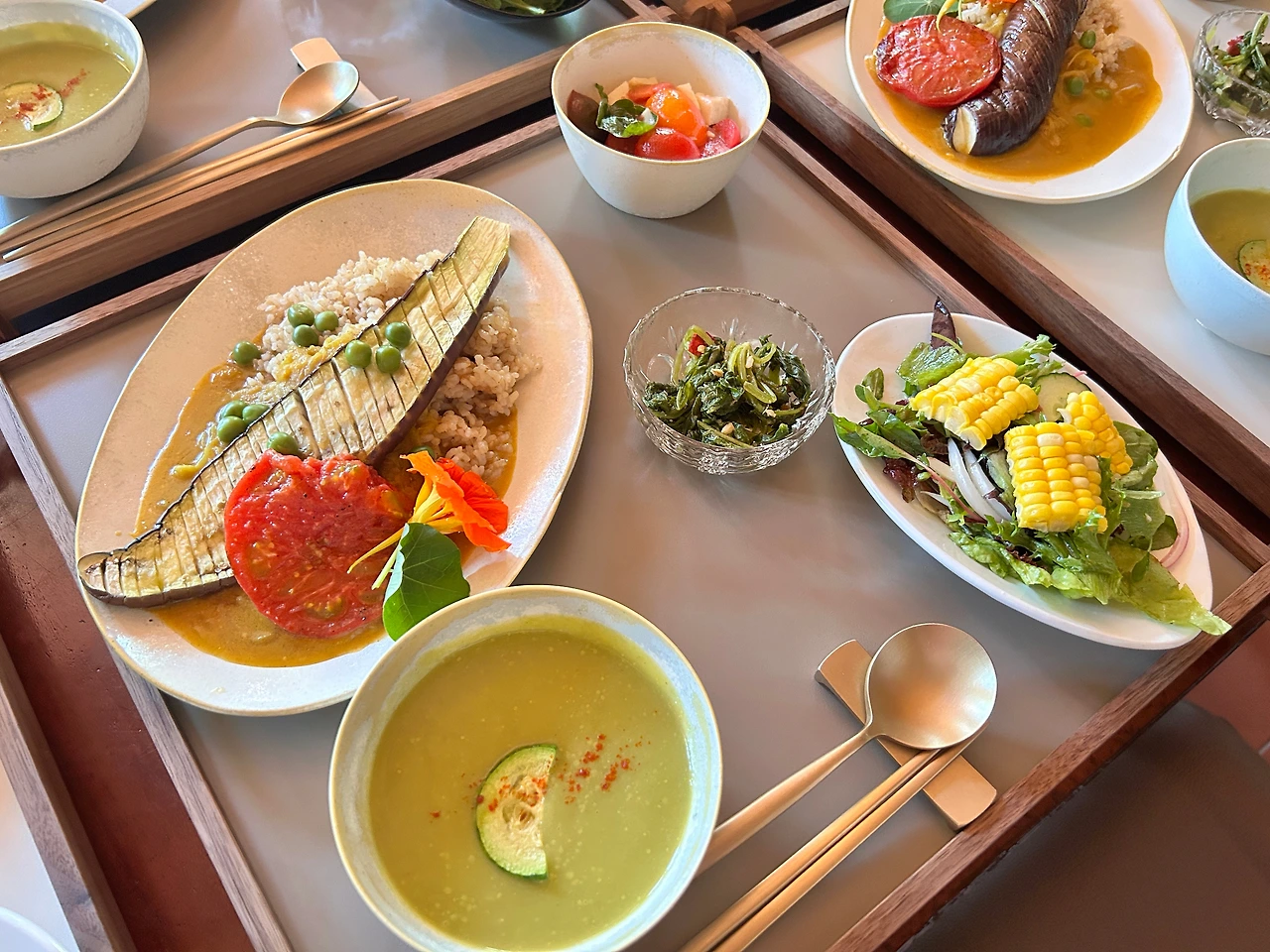 절기상 6월 '망종'(습도가 없는 건조한 더위)의 재철 식재료를 활용한 여름 카레라이스와 애호박완두콩 수프, 오트밀 폴랜타 샐러드, 올 어바웃 토마토샐러드, 채식 마늘딜바게트였다.