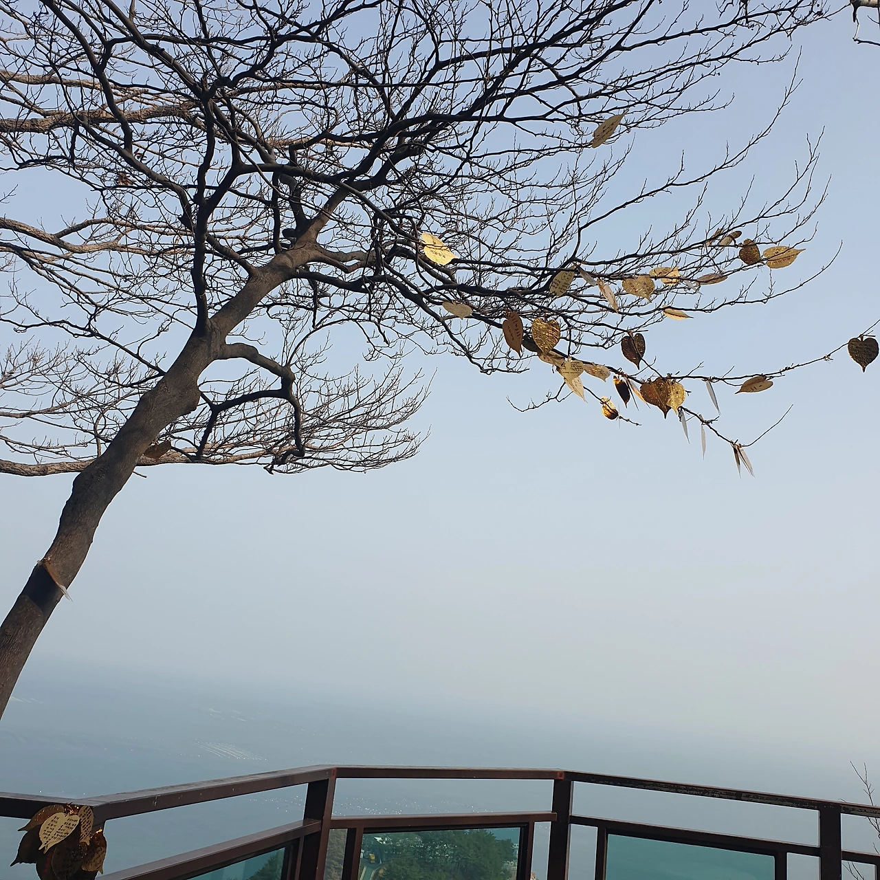 등용문을 지나자 탁 트인 바다가 보이는 전망대가 위치해 있다. 전망대 데크마다 소원을 적은 금박의 나뭇잎이 빼곡하다. 차를 파는 곳도 있었는데, 부처님께 인사를 먼저 드리자 싶어 내려오는 길을 기약한다. 전망대에서 바라보면 저 먼바다로 거북이 머리와 발의 형상이 또렷이 보인다. 풍수지리적으로 향일암의 지형은 경전을 등에 지고 용궁을 향해 바닷속으로 막 잠수해 들어가는 거북이의 형상이라고 한다. 머리 부분에는 군사시설이 위치하고 있어, 왠지 안타까운 마음이 들었다.